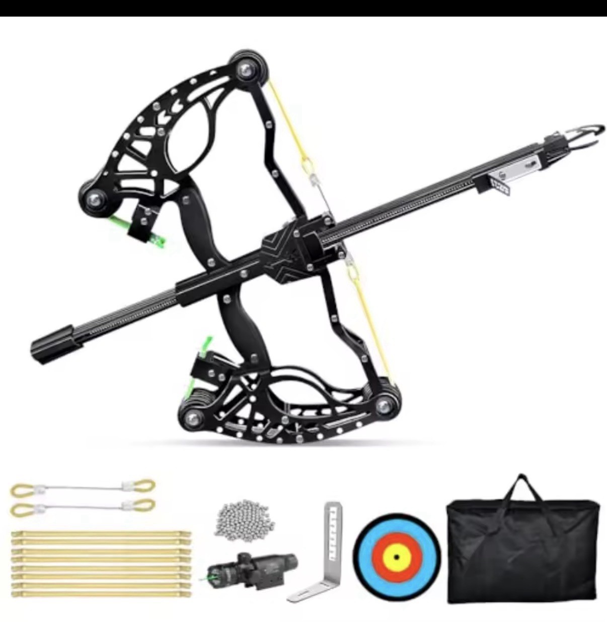 Included Components: Bow, Bag, Target, Steel Ball, Rubber Bands, Gloves