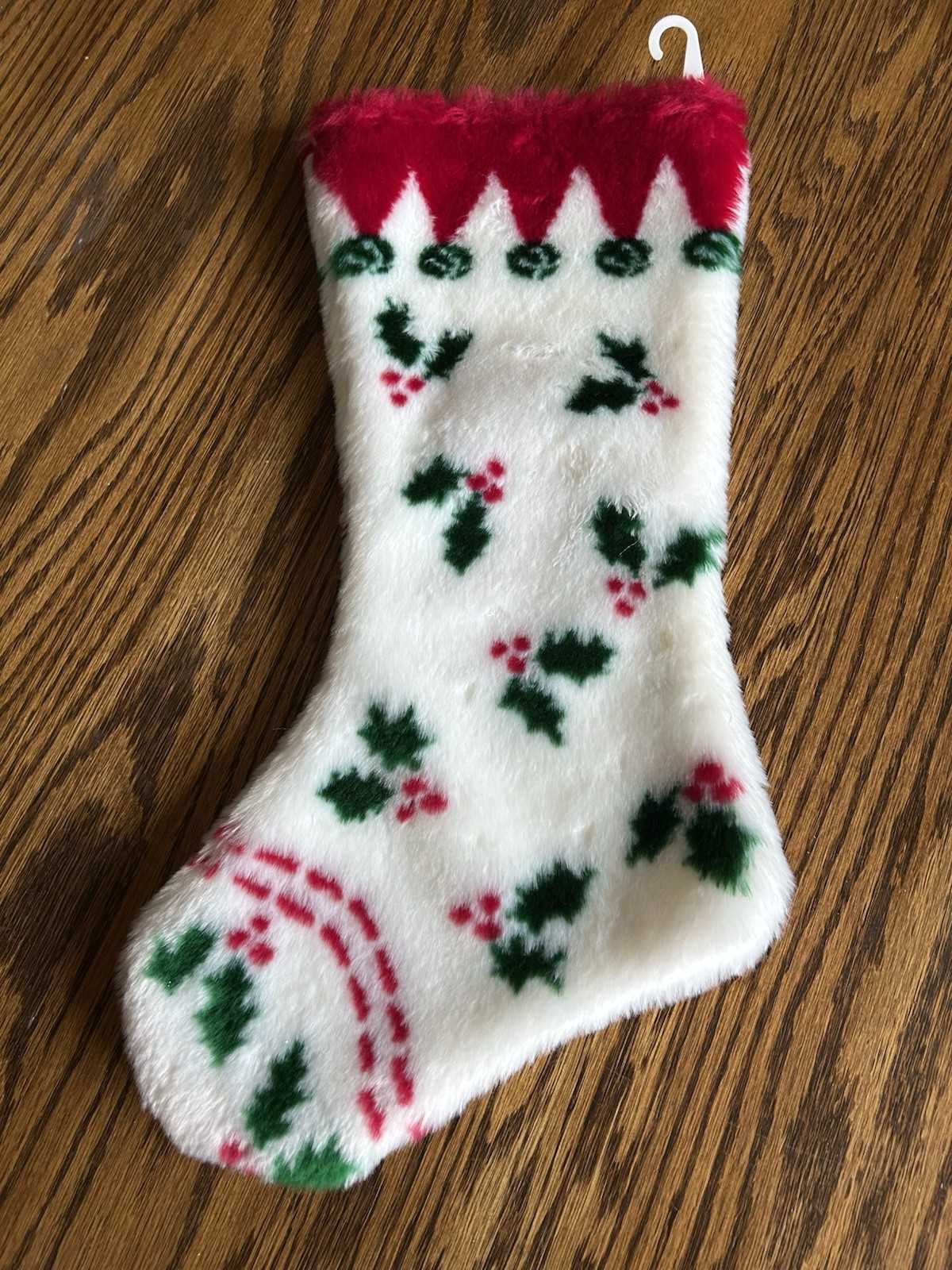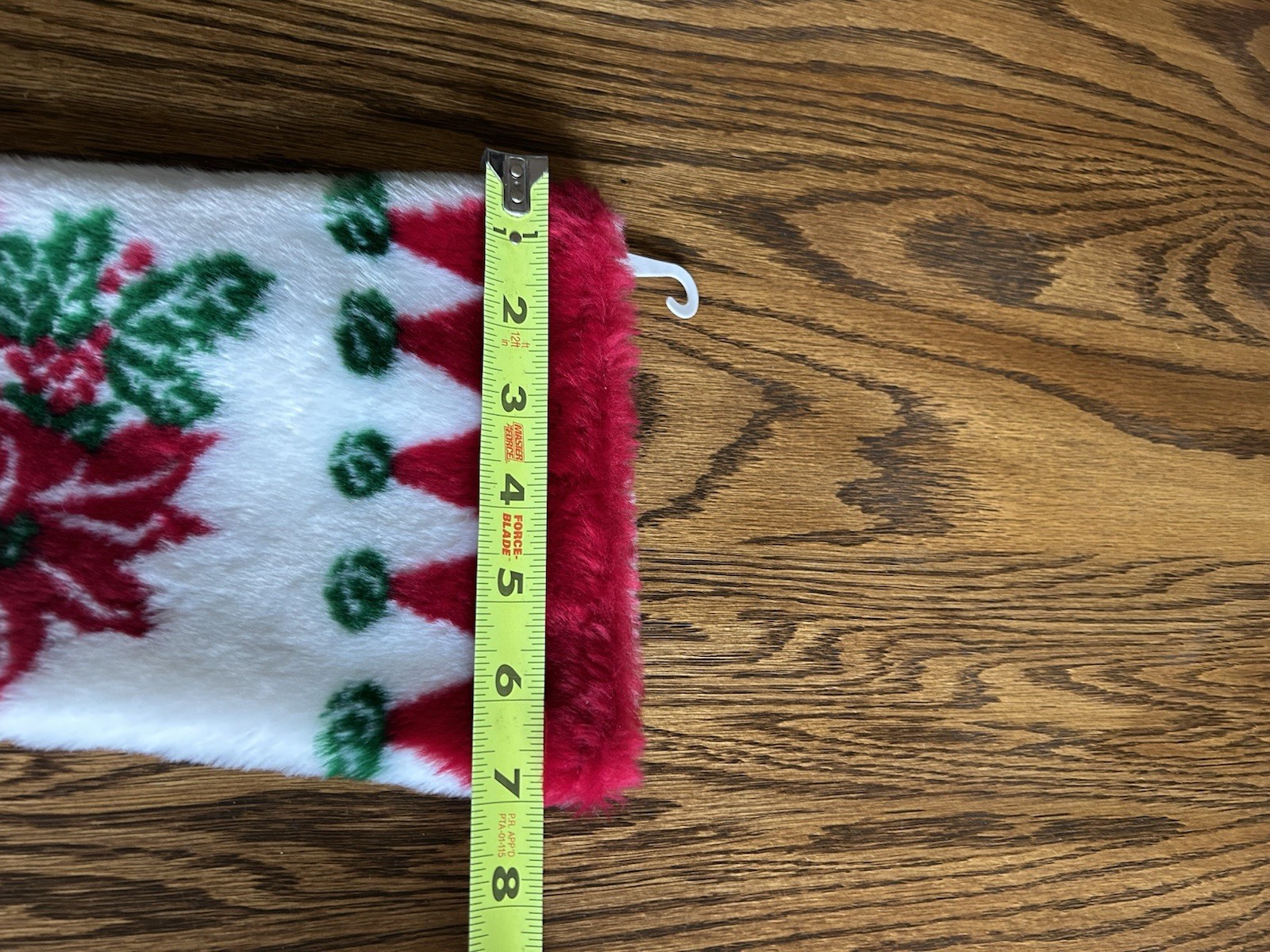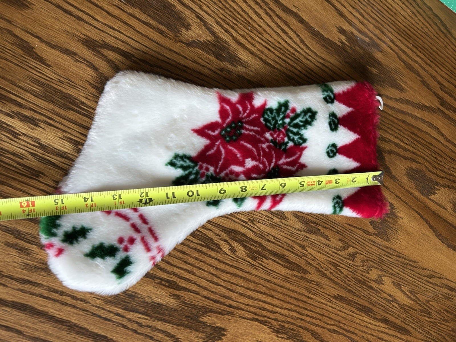 как выглядит Vtg Plush Faux Fur Christmas Stocking Poinsettia Holly Theme фото
