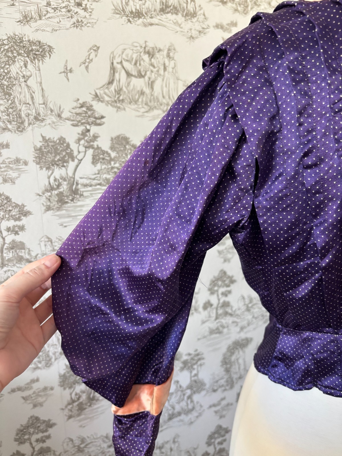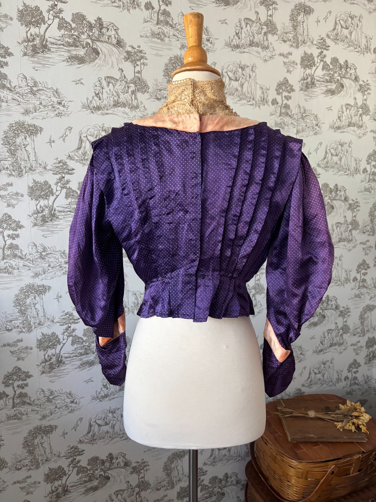как выглядит Rare Antique 1900s Edwardian Purple Silk Blouse Lace High Neck and Peach Velvet фото