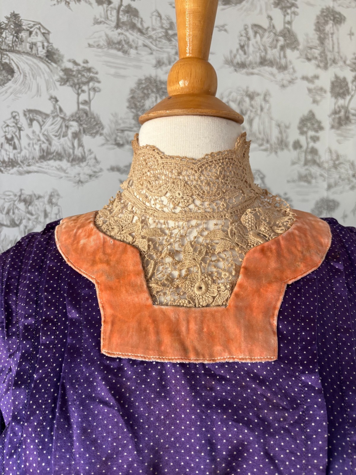Rare Antique 1900s Edwardian Purple Silk Blouse Lace High Neck and Peach Velvet