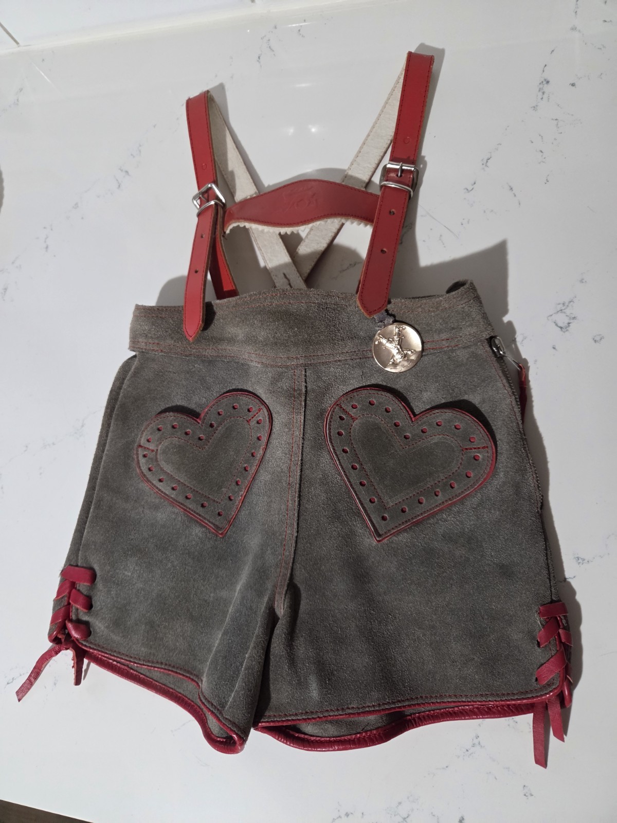 как выглядит Vtg Childrens Bergfreund Lederhosen EU 98 US 3-4 Gray Suede Red Leather Straps фото