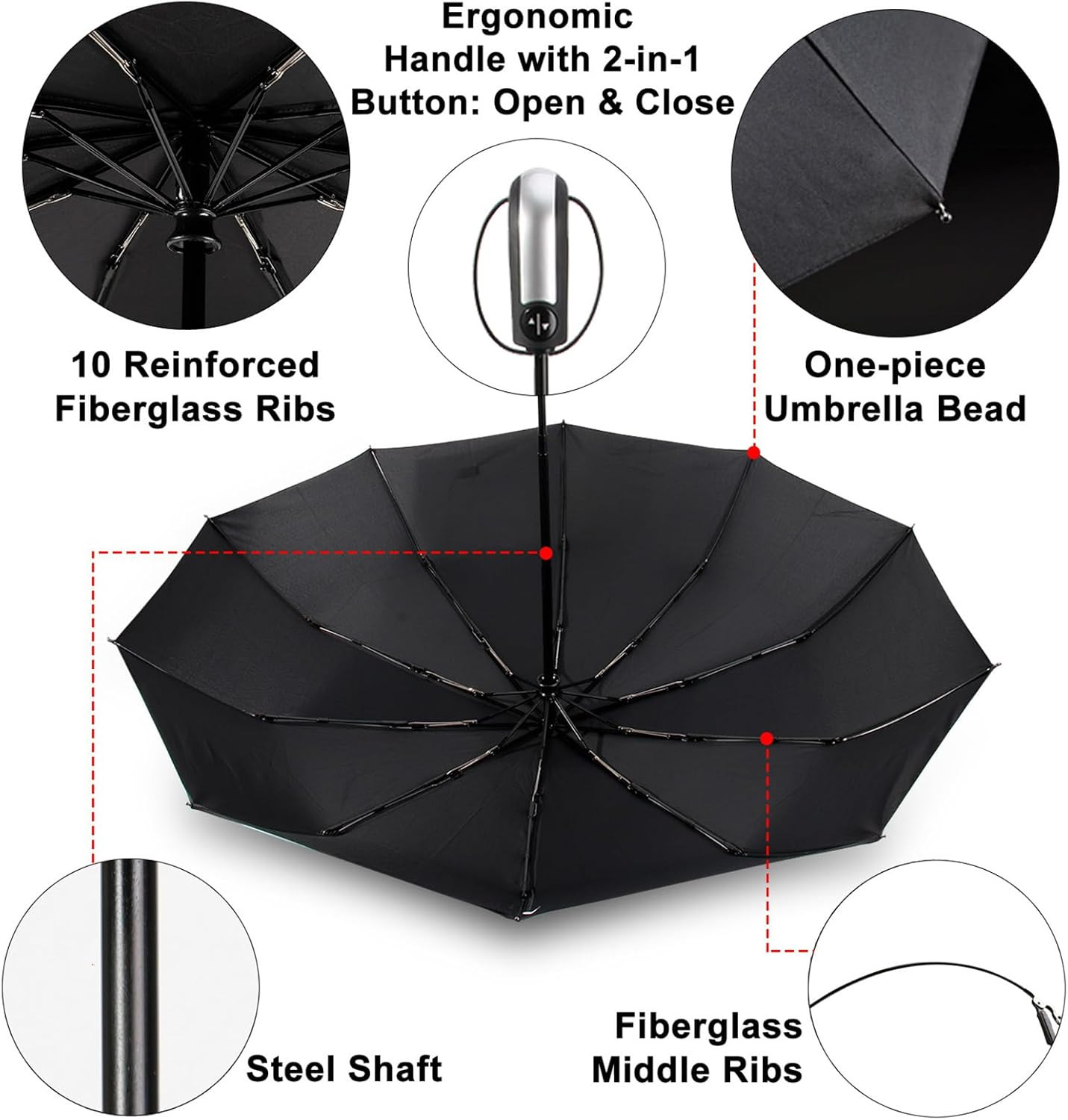 Travel Umbrella Windproof with 46 Inches Large Canopy 10 Reinforced Fiberglass R