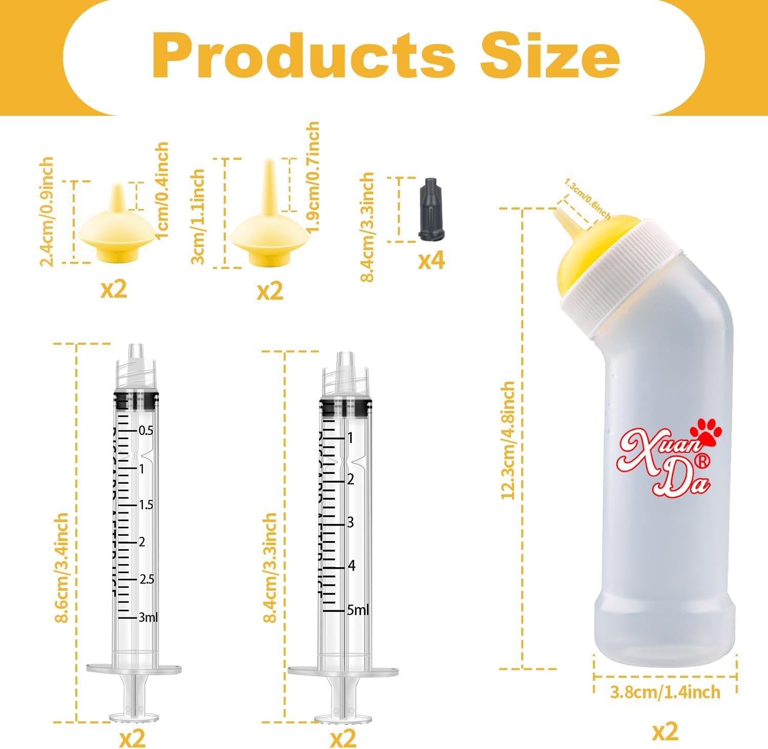 Kitten Nursing Nipple with Syringe, Wide Mouth Angled Puppy Model 1, Yellow