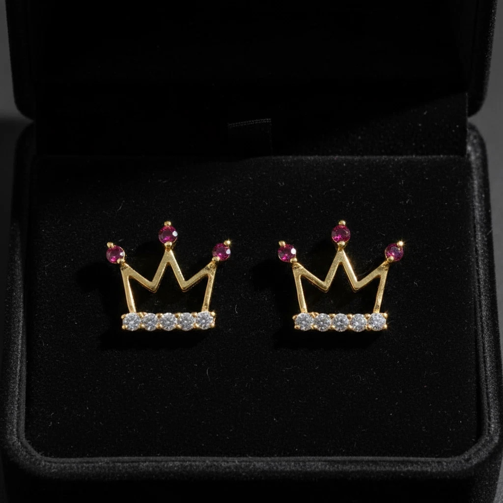 Solid 14K Yellow Gold Crown CZ Stud Earrings Sparkling Royal Design Gift Unisex