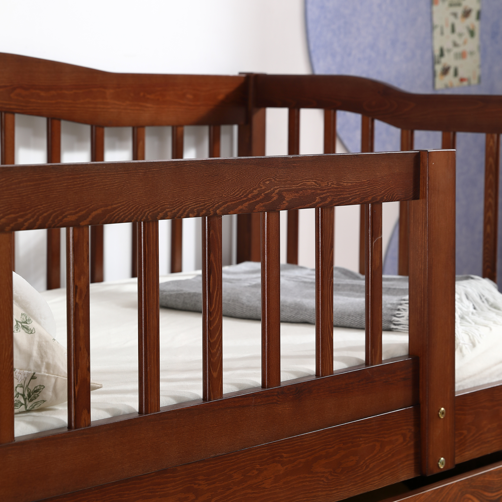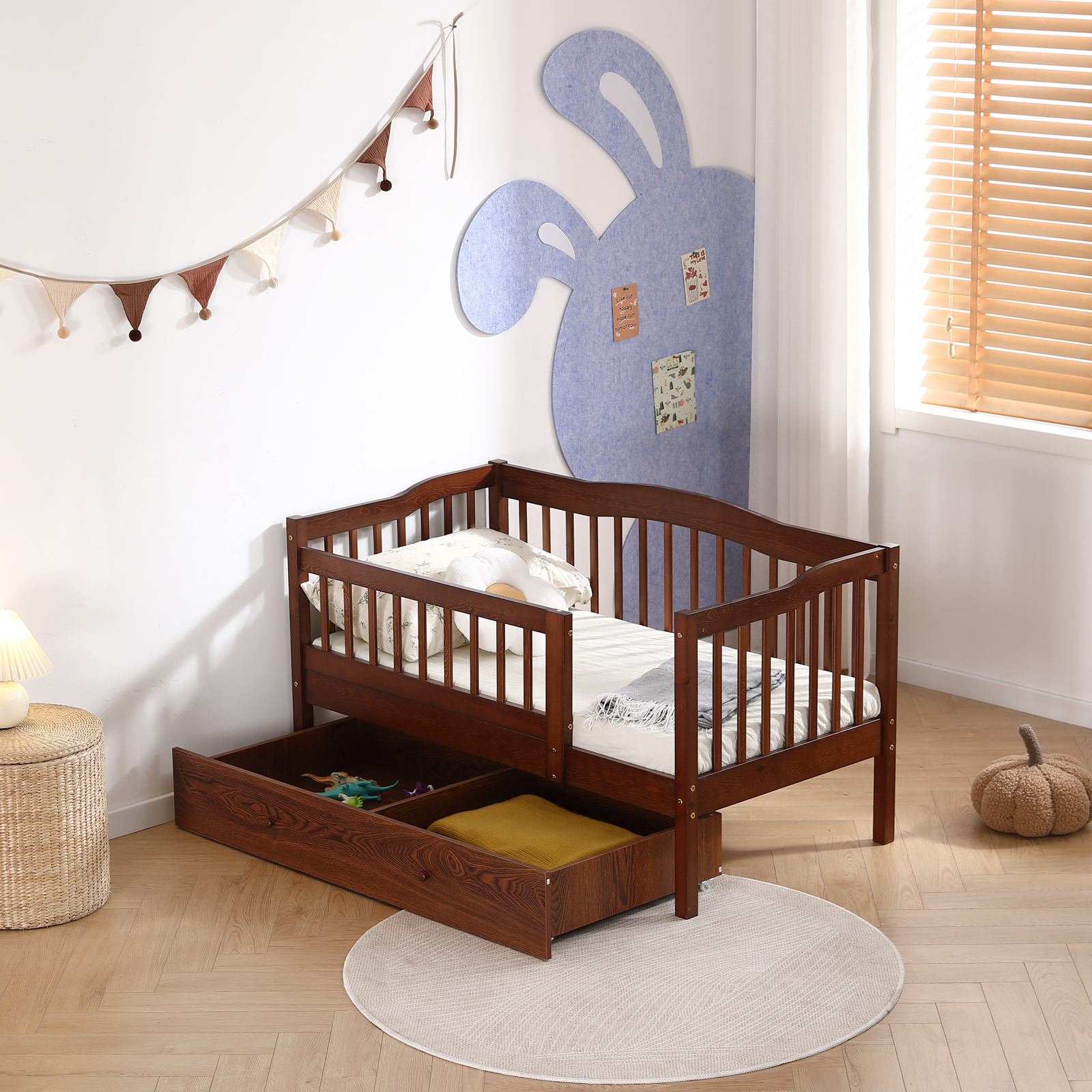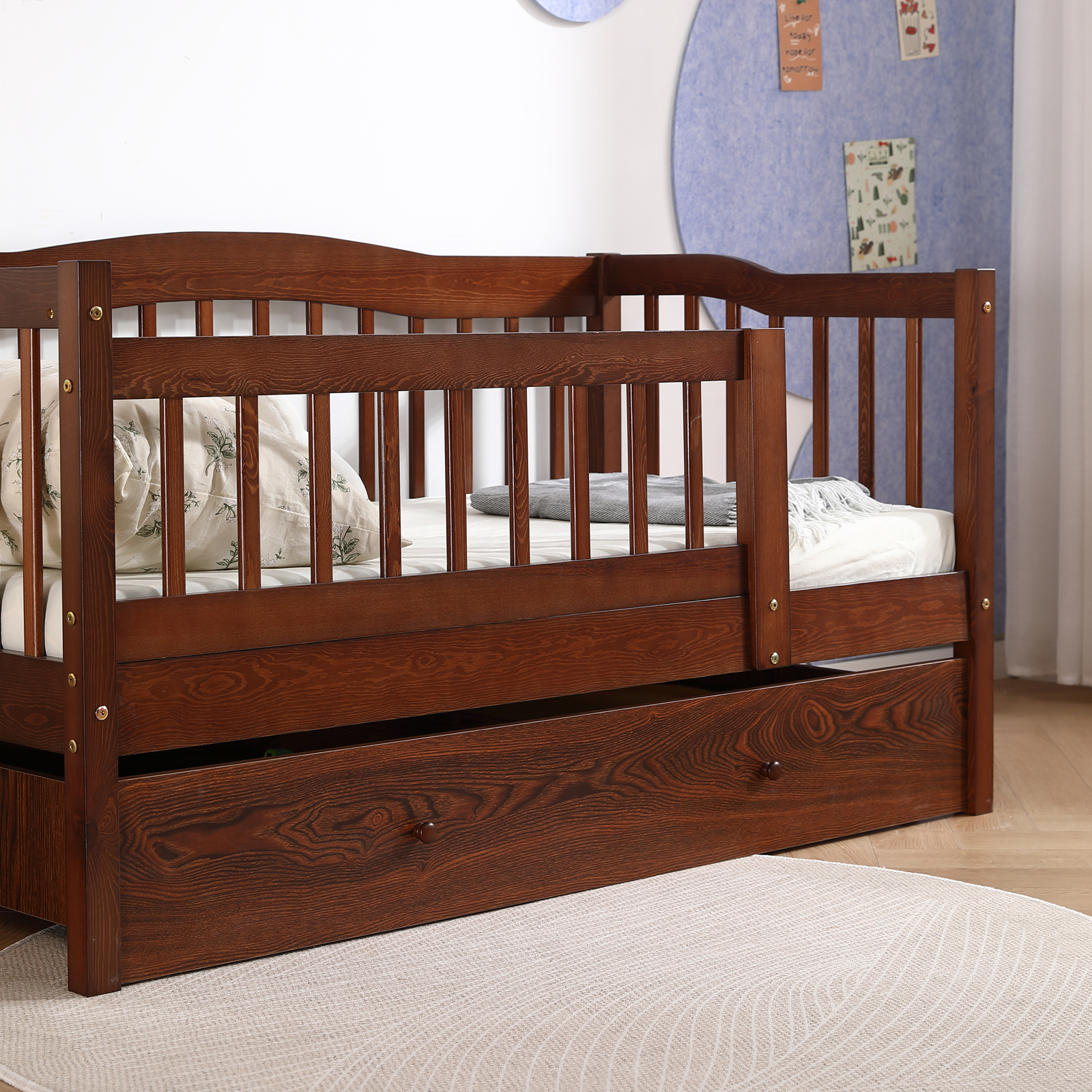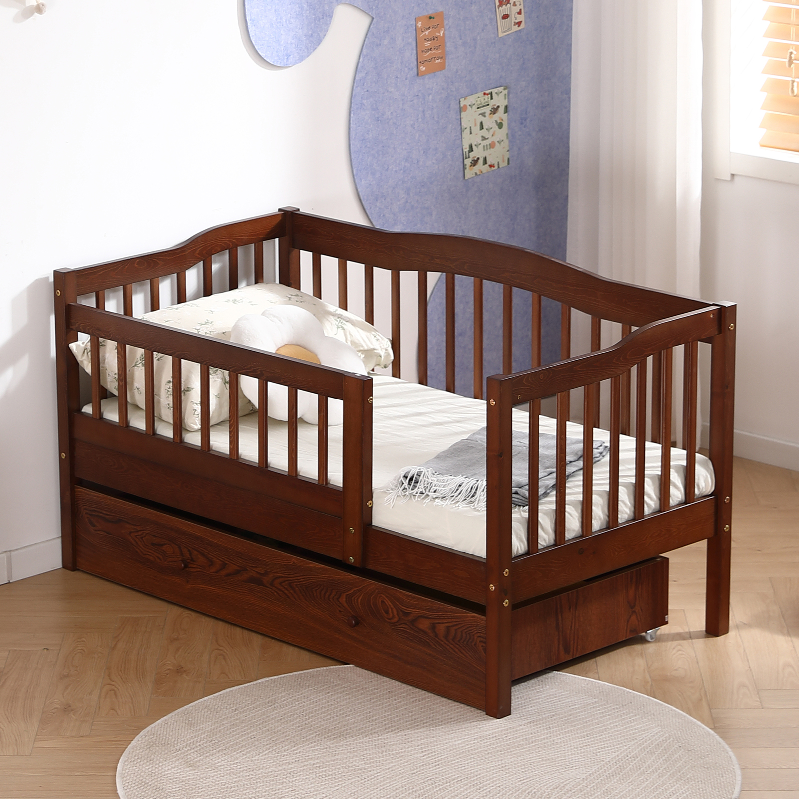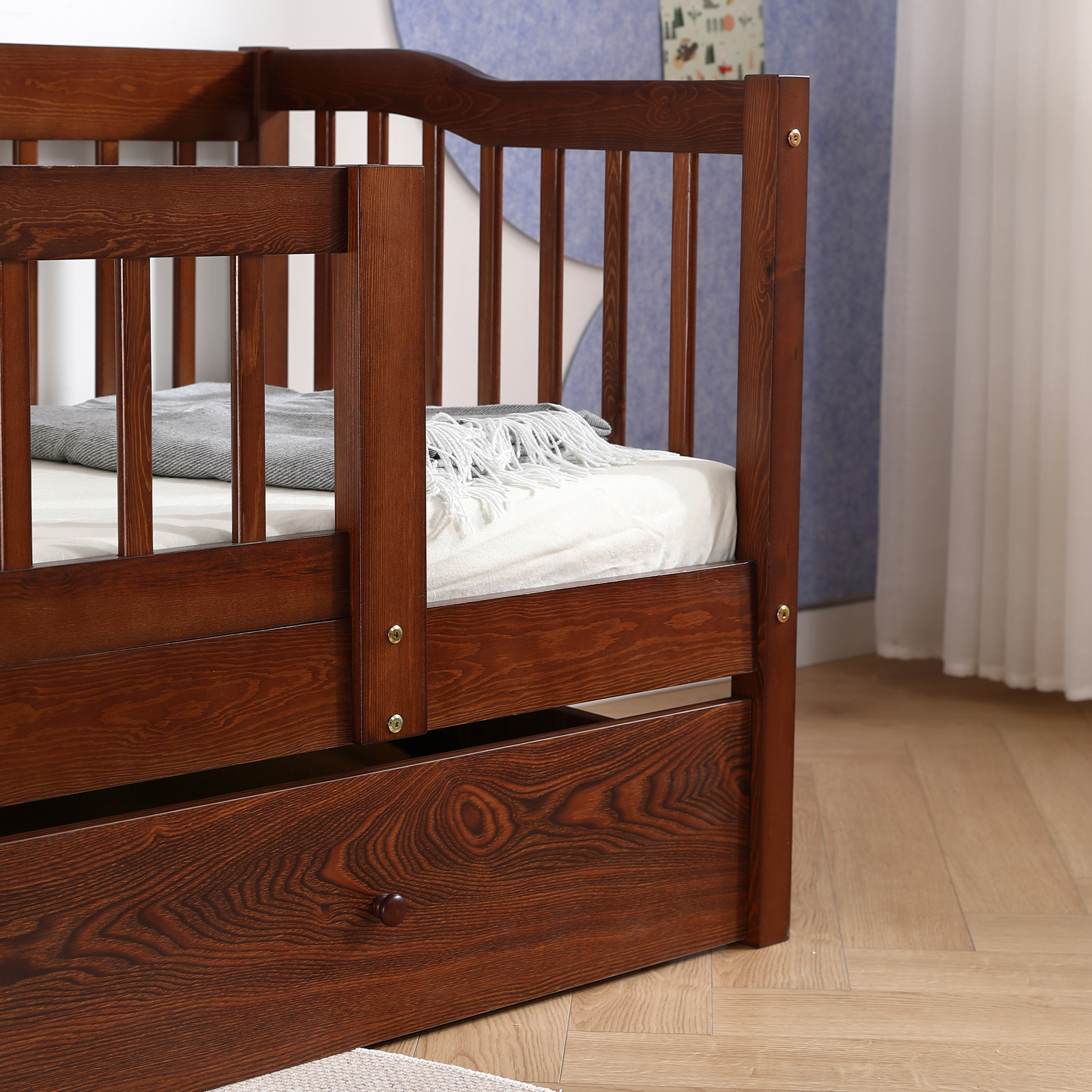 Kids Wood Bed Frame with Drawers Twin Size Bed with Safety Rails for Toddlers