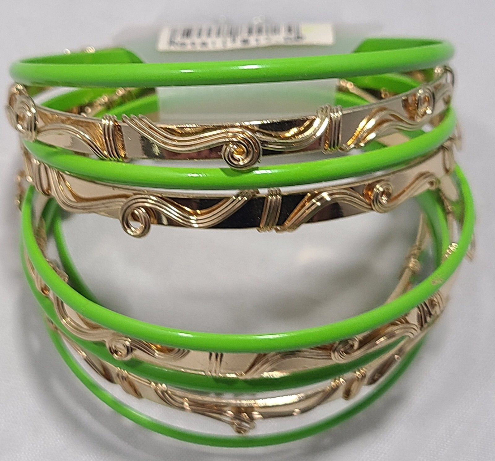 Gold tone bracelet bangle Green thin set pack of 7 kids girls 7 1/8 long