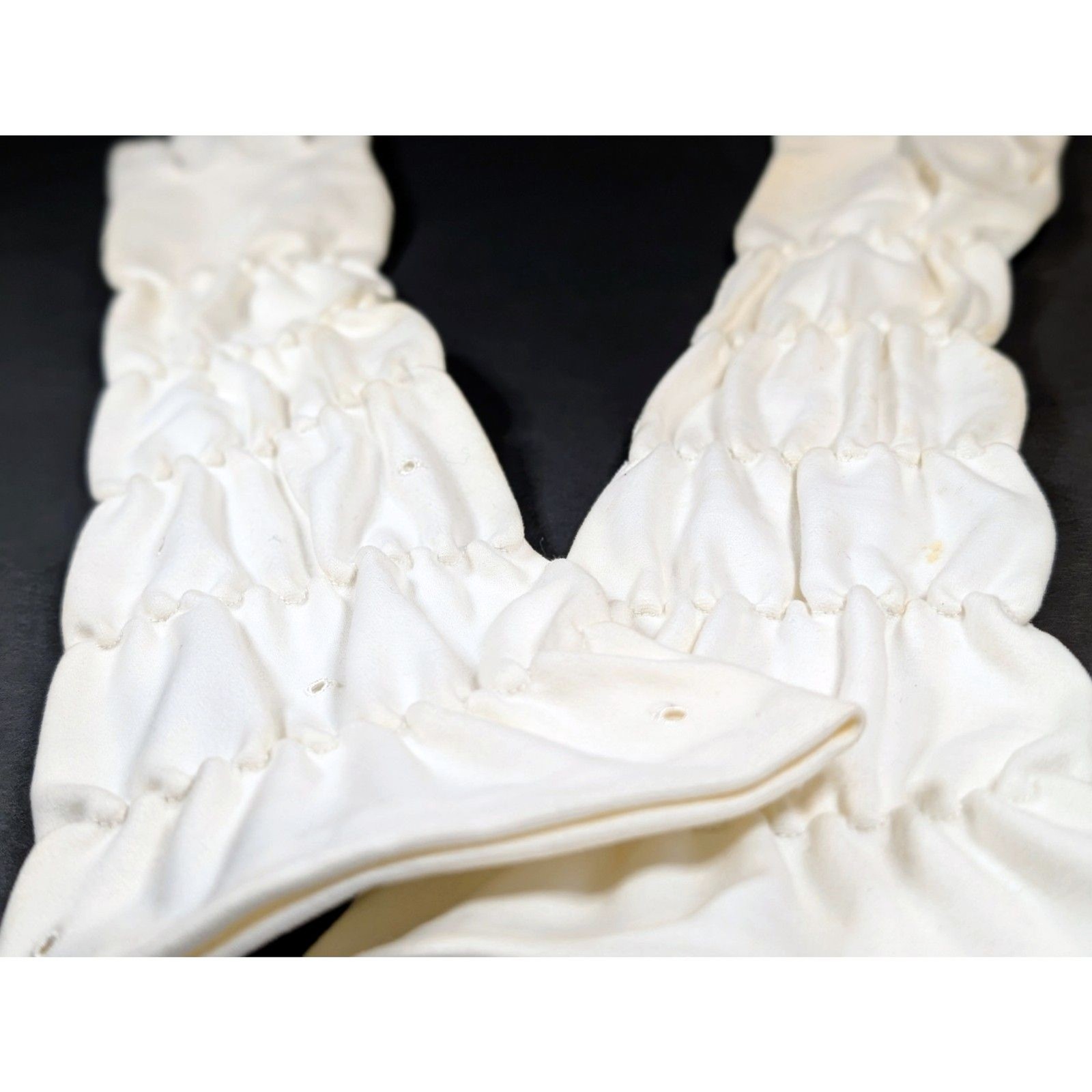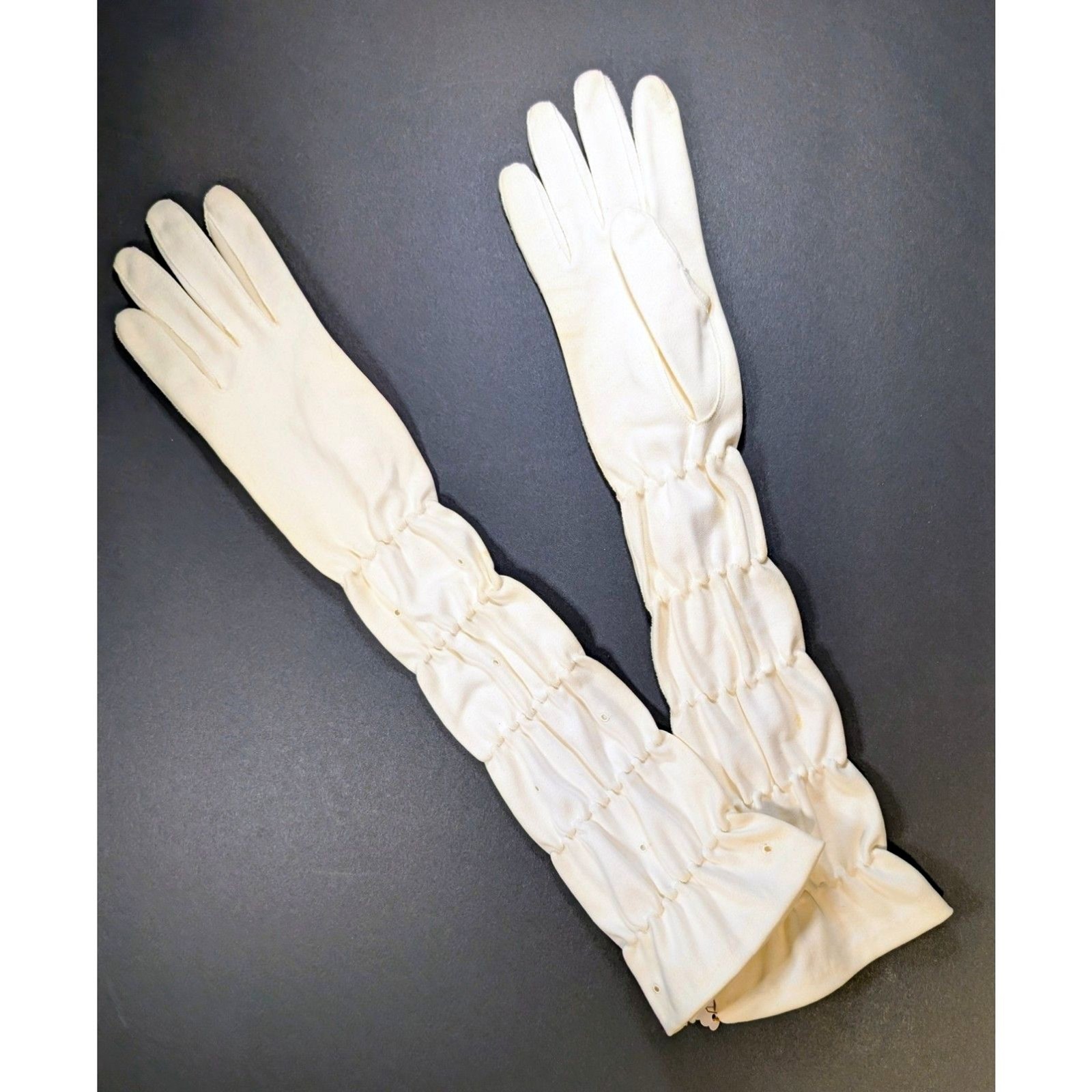 как выглядит Vintage Ruched Ivory Cloth Opera Gloves with Eyelet Detail, Made in Germany фото