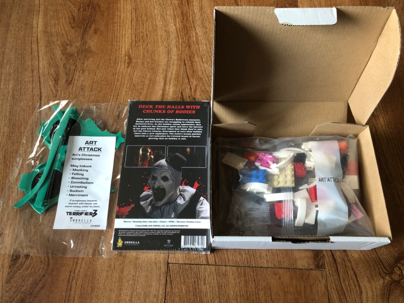 Terrifier 3 VHS with Art The Clown Brick Set and Art s Christmas Glasses