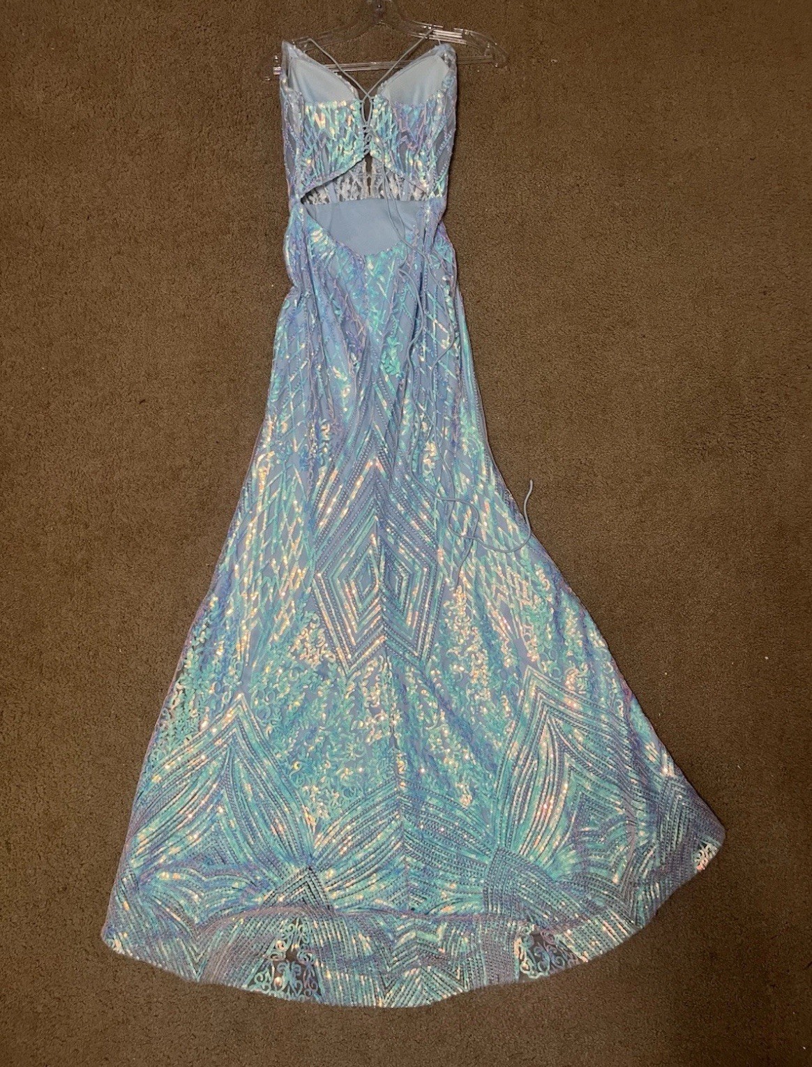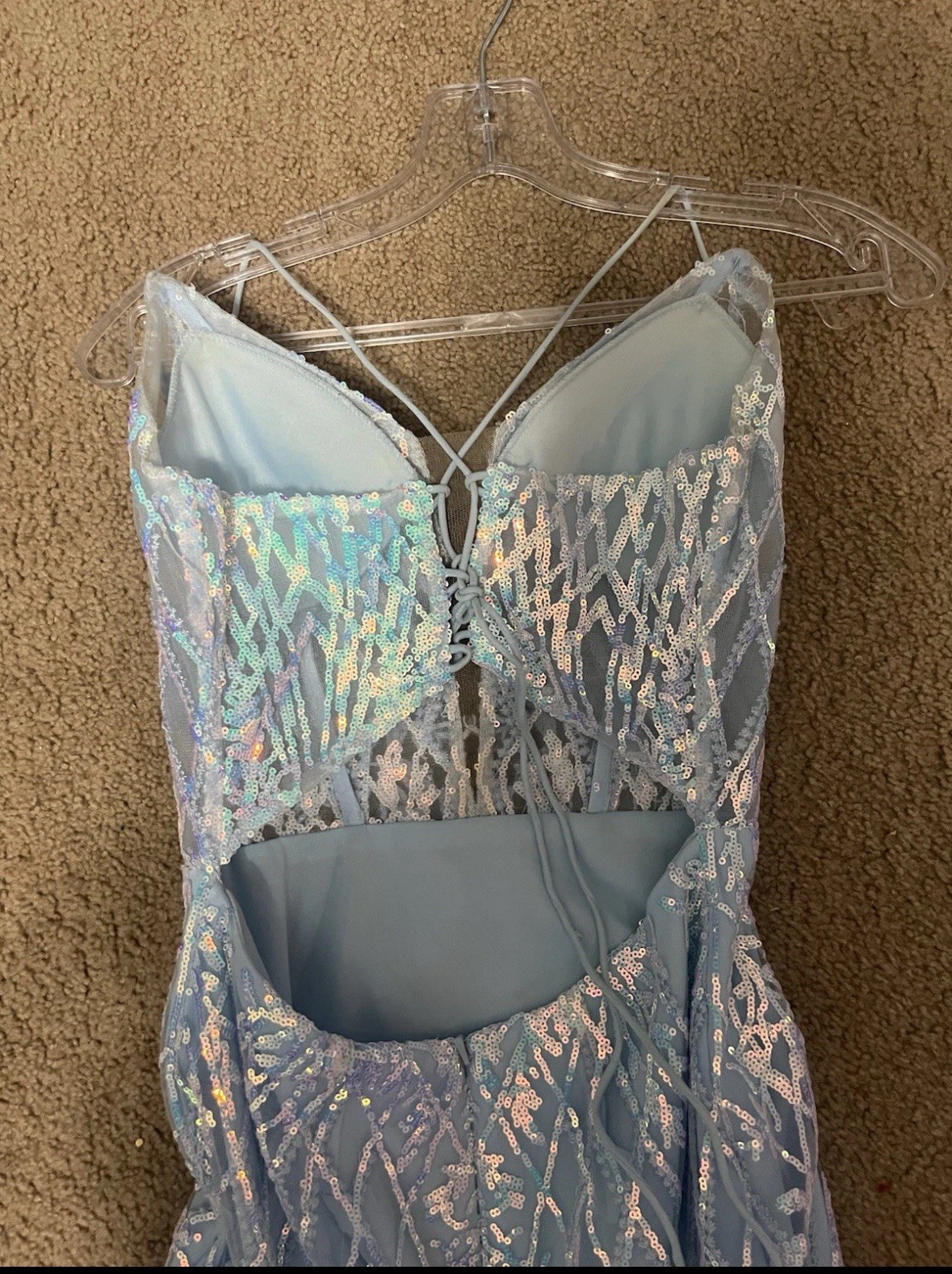 как выглядит Light Blue Sequen Prom Dress Size 0 Thin Spaghetti Straps Cross Tie Back Formal фото