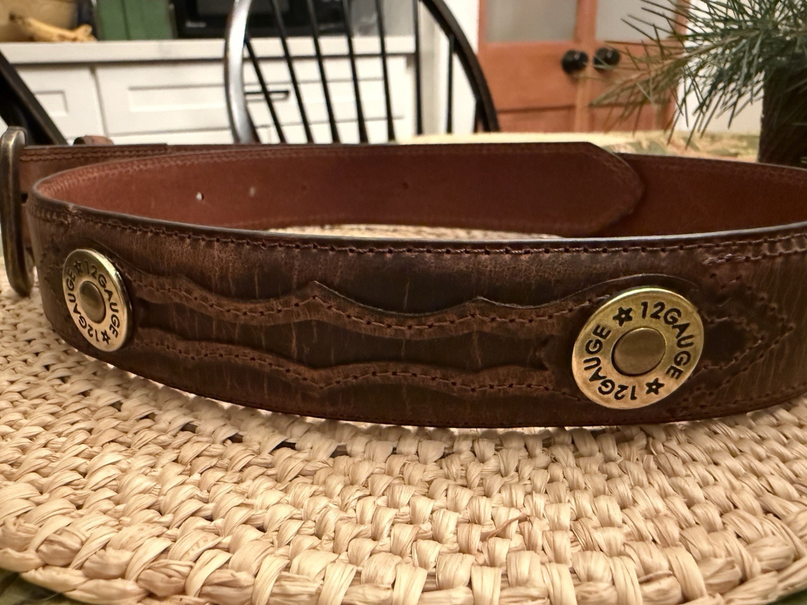 как выглядит AndWest 12 Gauge Gold Concho Belt 32 Waist Brown Genuine Leather 1 1/2 Wide EUC фото