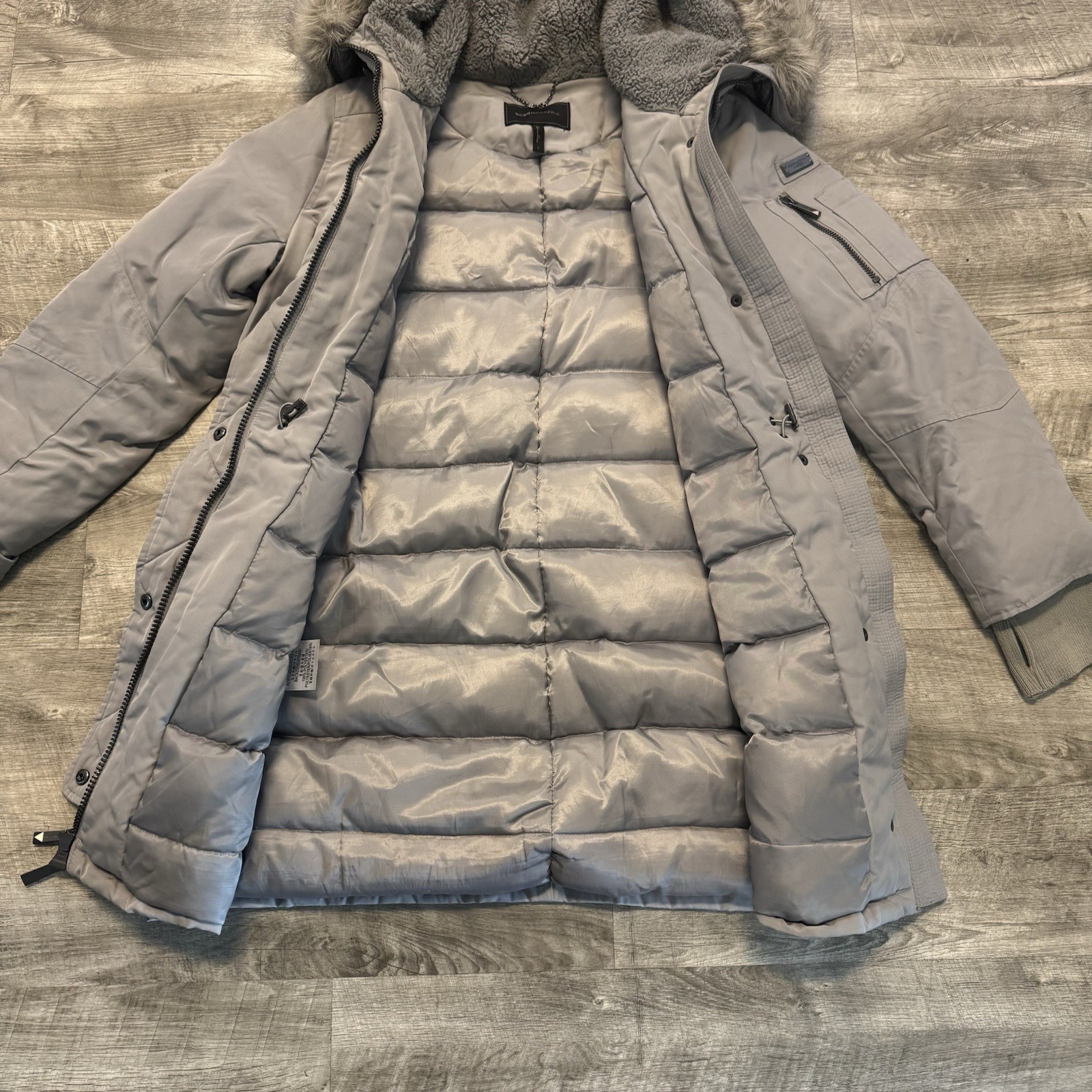 BCBGMAXAZRIA Light Gray Parka Coat Detachable Faux Fur Trim Hood Front Zip Sz. L