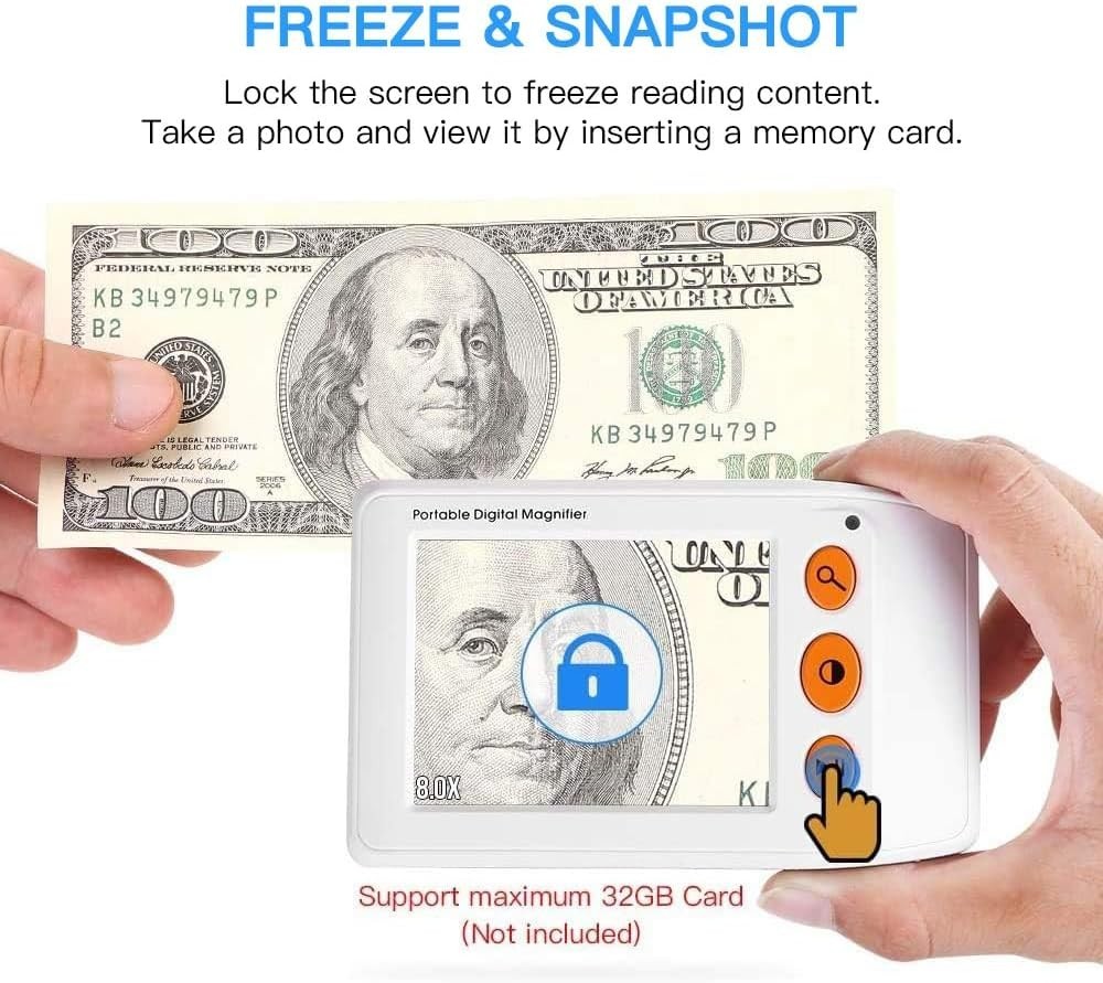 Особенности: Portable, 2x-25x magnification, Short-term reading assistance, Portable and ideal for quick visual aid, 8 adjustable color modes, Snapshot function, Screen lock function, Capture images, Playback captured images, Freeze screen function, Supports TF cards up to 32GB, AV output for larger display, Connects to television, Ergonomic design, Foldable bracket, Compact and lightweight, Smooth slide across books, maps, or newspapers