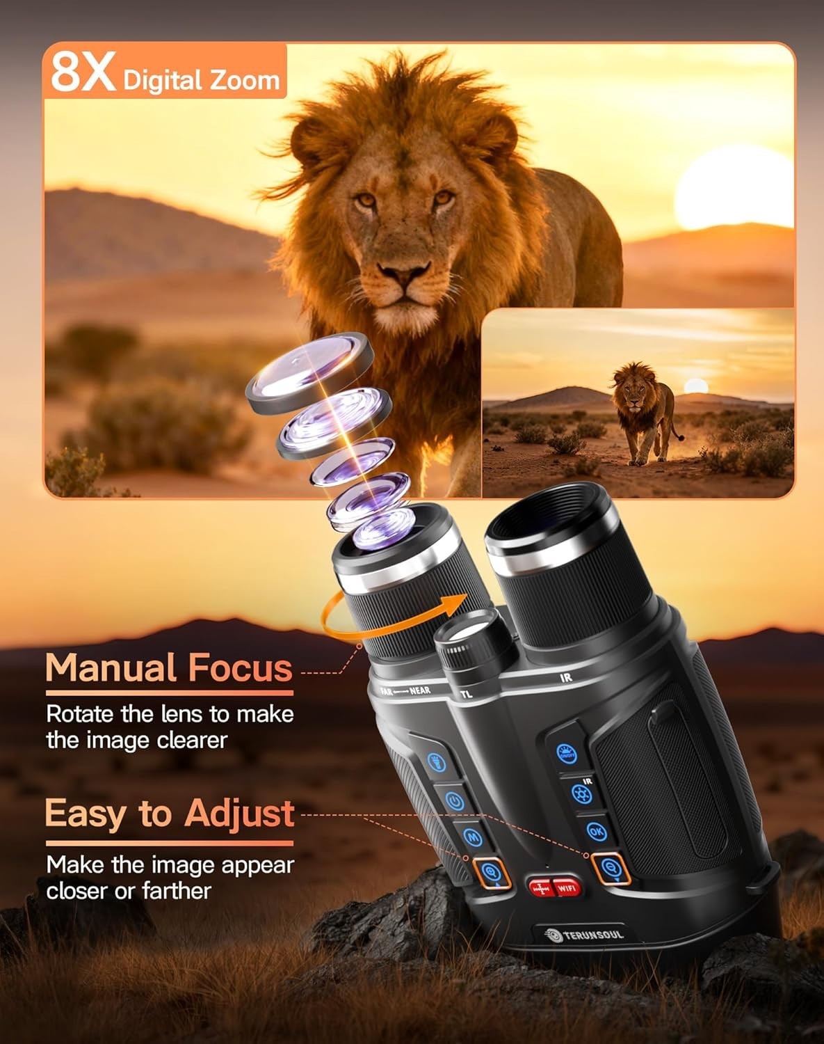Особенности: Night Vision, High Magnification, LCD Display, Portable, Compact Design, Waterproof, Tripod Mount, Adjustable Brightness, Anti-shake Design, Built-in Microphone, Infrared Light, Multiple White Balance Modes, USB-C Compatible