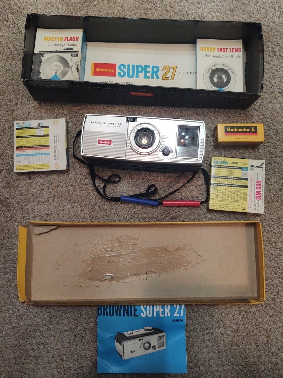 Vintage Kodak Brownie Auto 27 Camera, Film, Flash Bulb, Instructions And Box