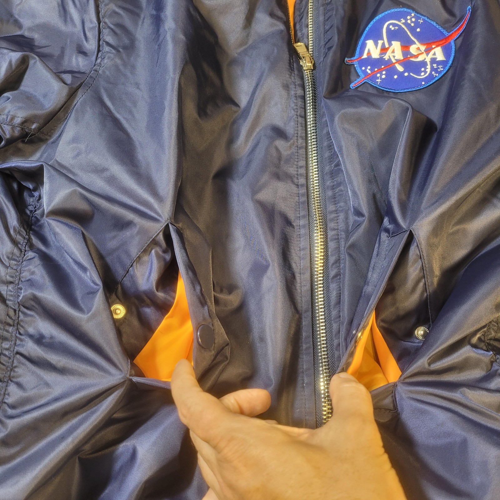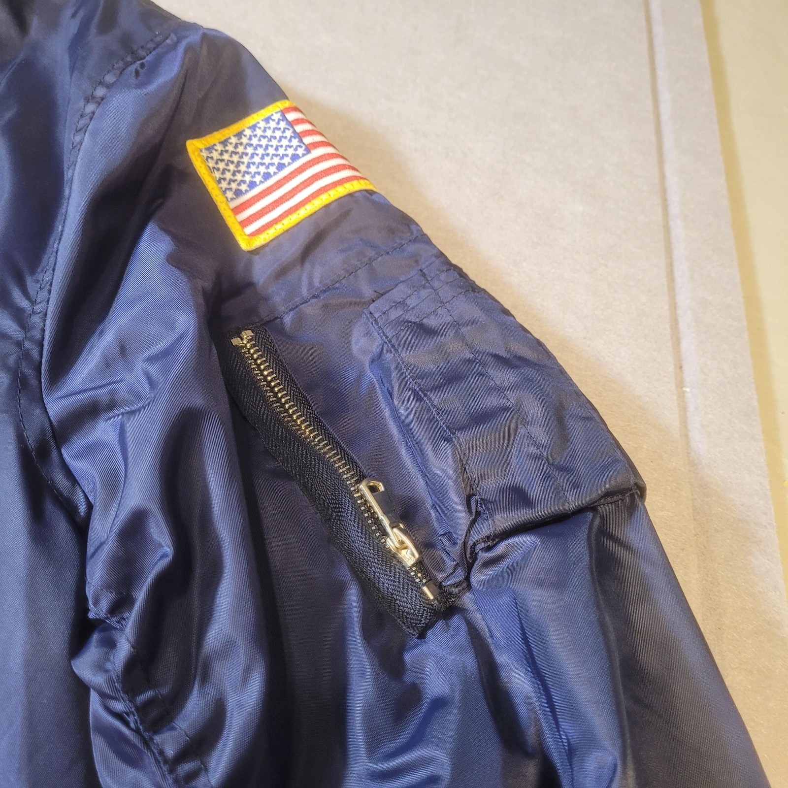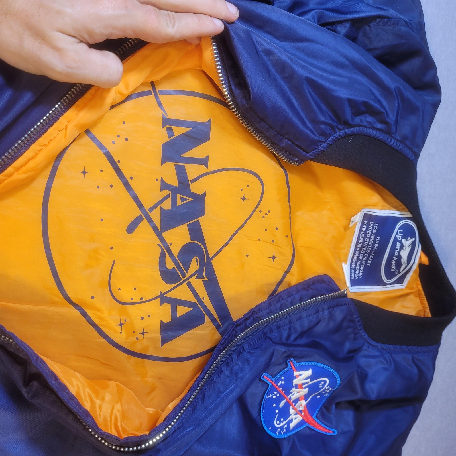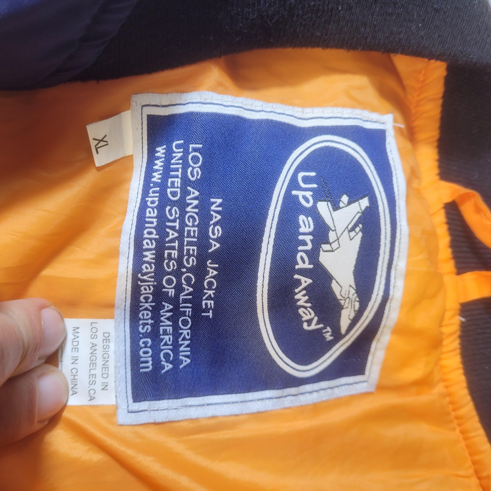 как выглядит NASA Bomber Jacket Mens XL Blue Up And Away Flight MA-1 Style Patch Space фото