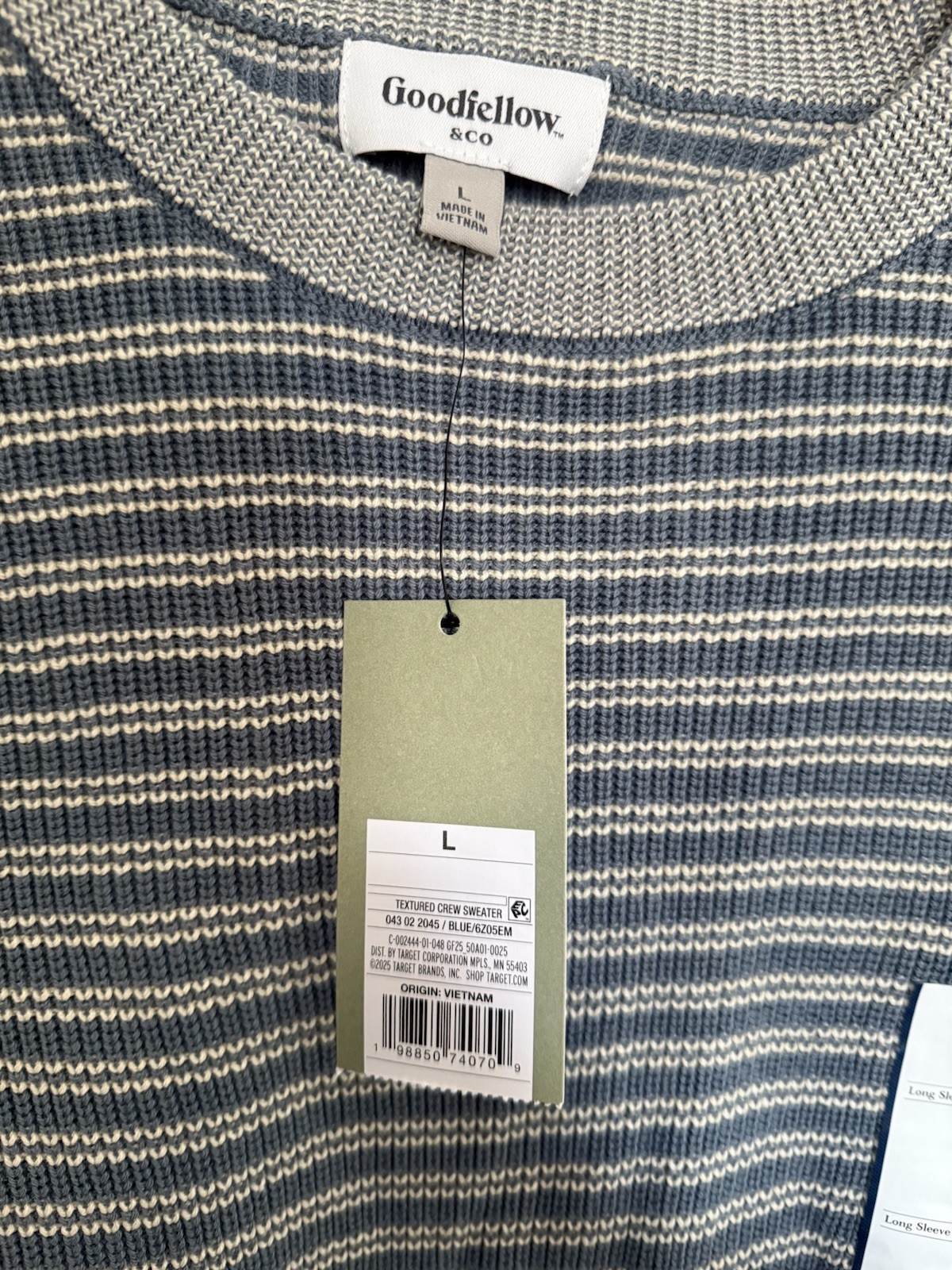 Goodfellow Co Men Crew Neck Sweater Gray and Blue Stripped Size Large NWT