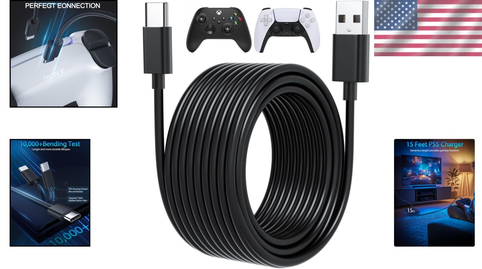 Extra Long 15ft USB C Cable for PS5 Controllers - Fast Charge Play Undisturbed