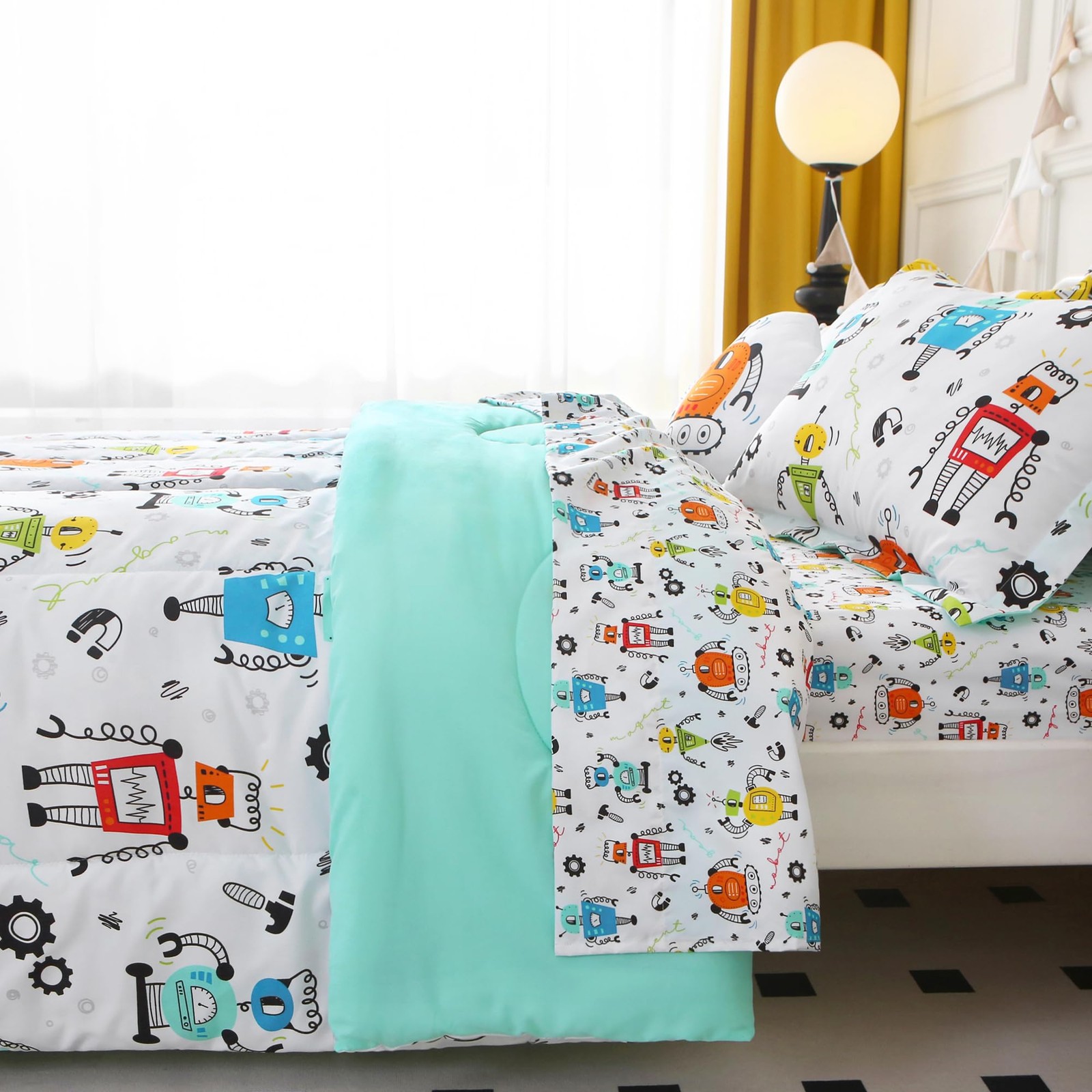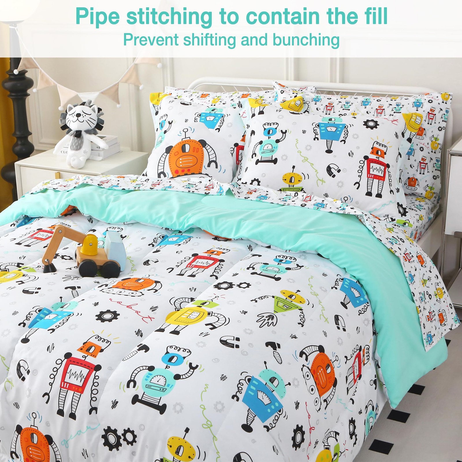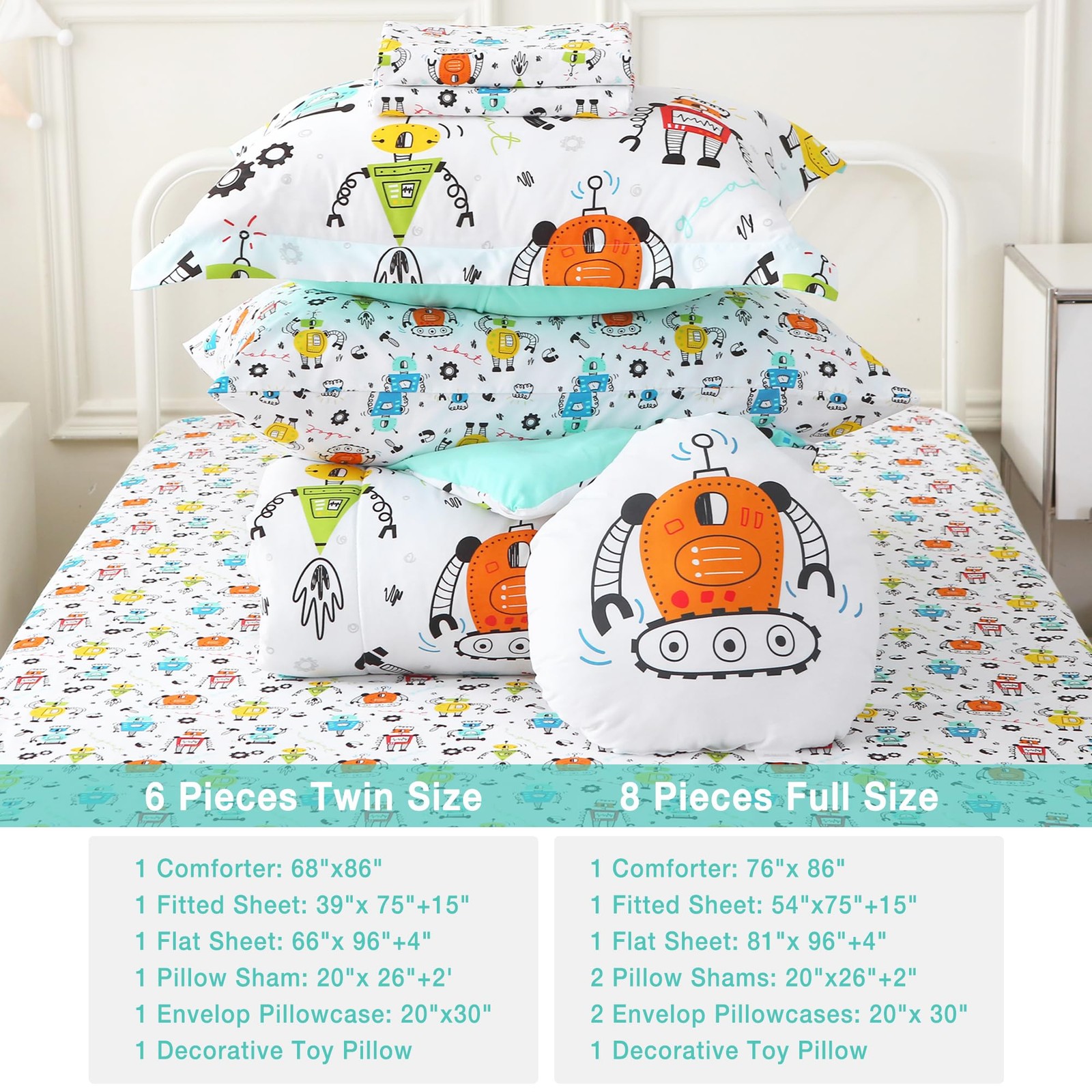 Full Size Comforter Sets for Boys Kids, 8 Pieces Bed in a Bag White Robot Bed...