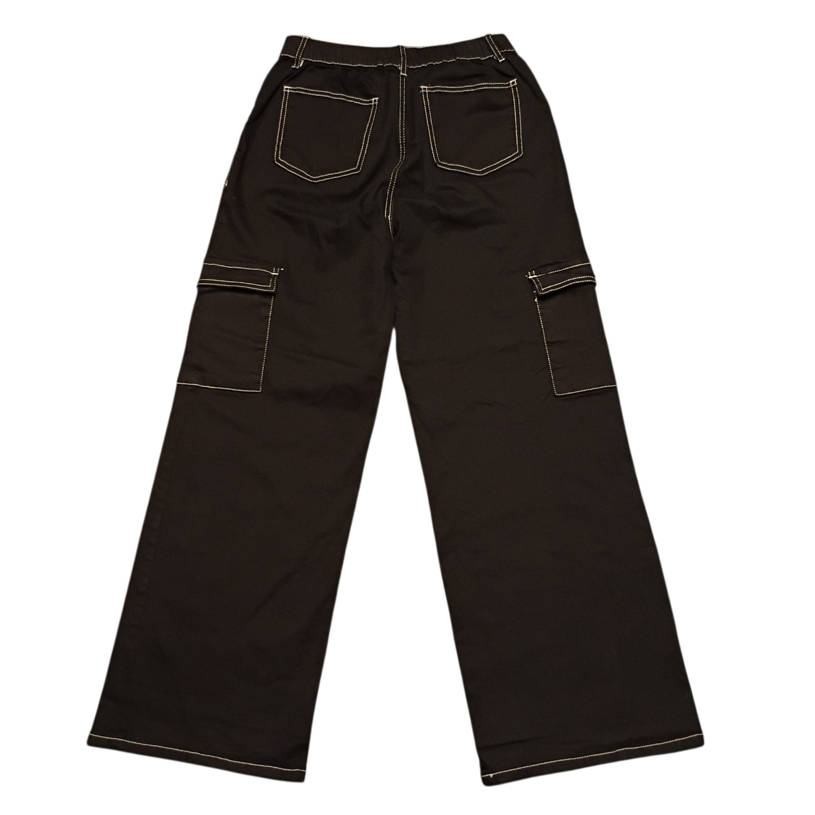 90s Y2K Women's Black Cargo Wide Leg Pants Large Cotton Stretchy White Stitch
