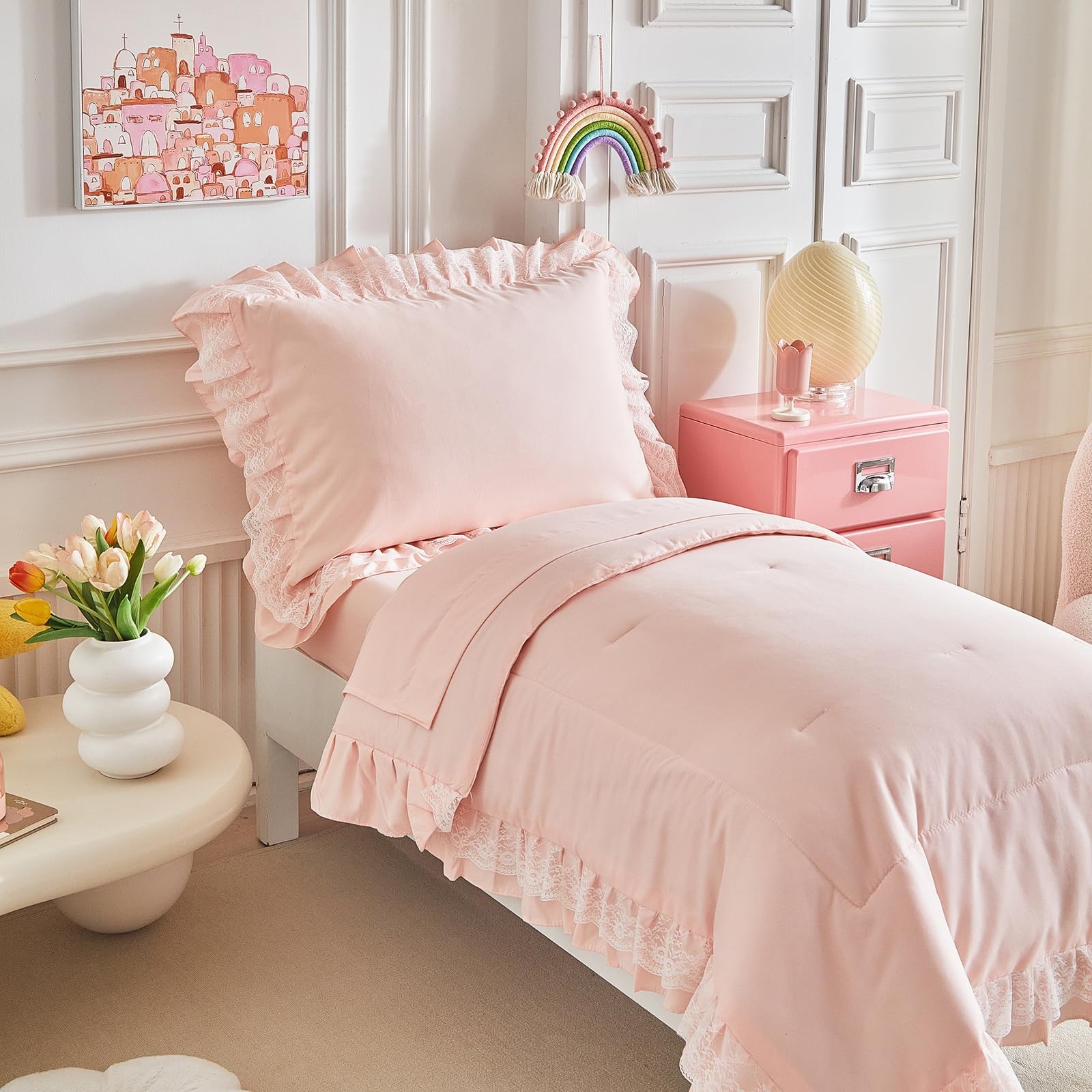 Ruffled Lace Toddler Bedding Set with Ruffle Fringe, Solid Color 4 Pieces Tod...