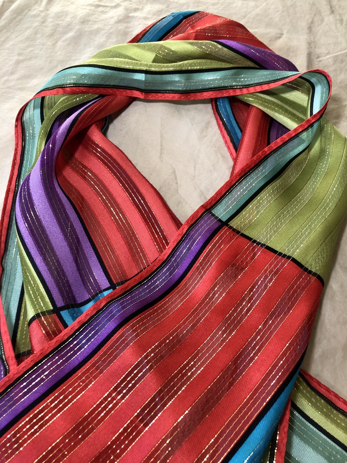 как выглядит VTG JONES NEW YORK Vibrant Gold Red Multi-Color Sheer 100 Silk Scarf 52 x 10 фото