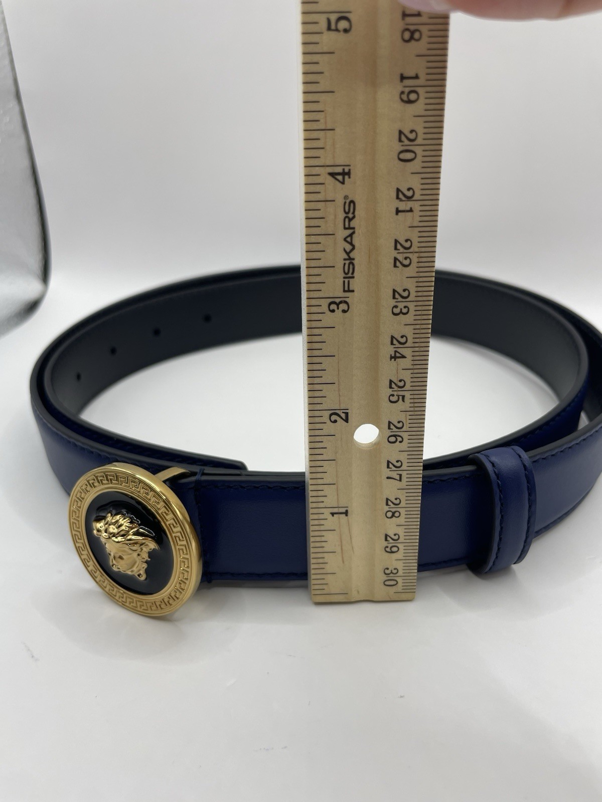 как выглядит Versace Gold Medusa-Buckle Blue Leather Belt 115 46 NWT 550 Authentic фото