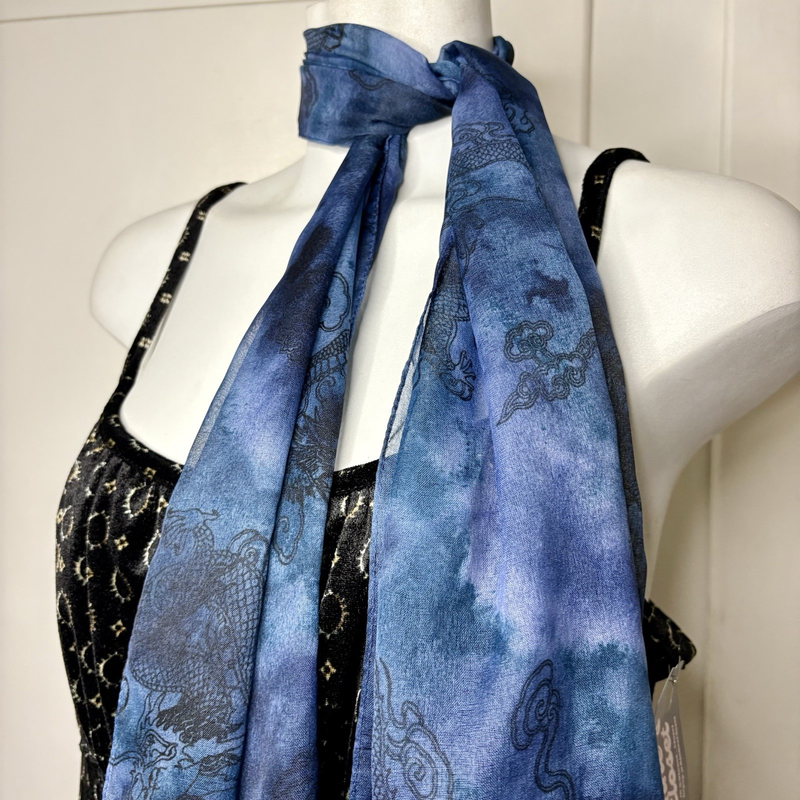 Vintage 90s Art of the Scarf Navy Blue Sheer Dragon Print Long Rectangle Scarf