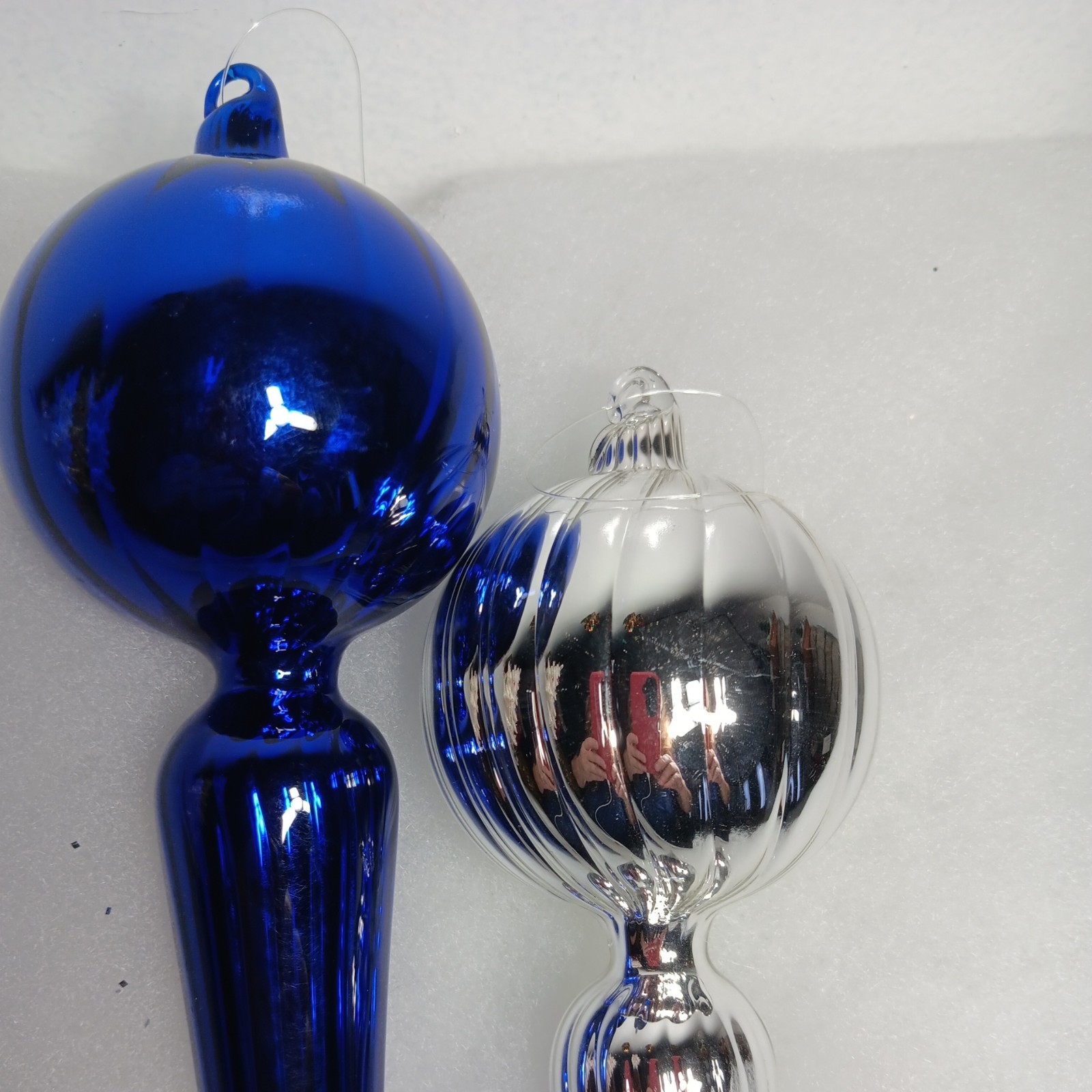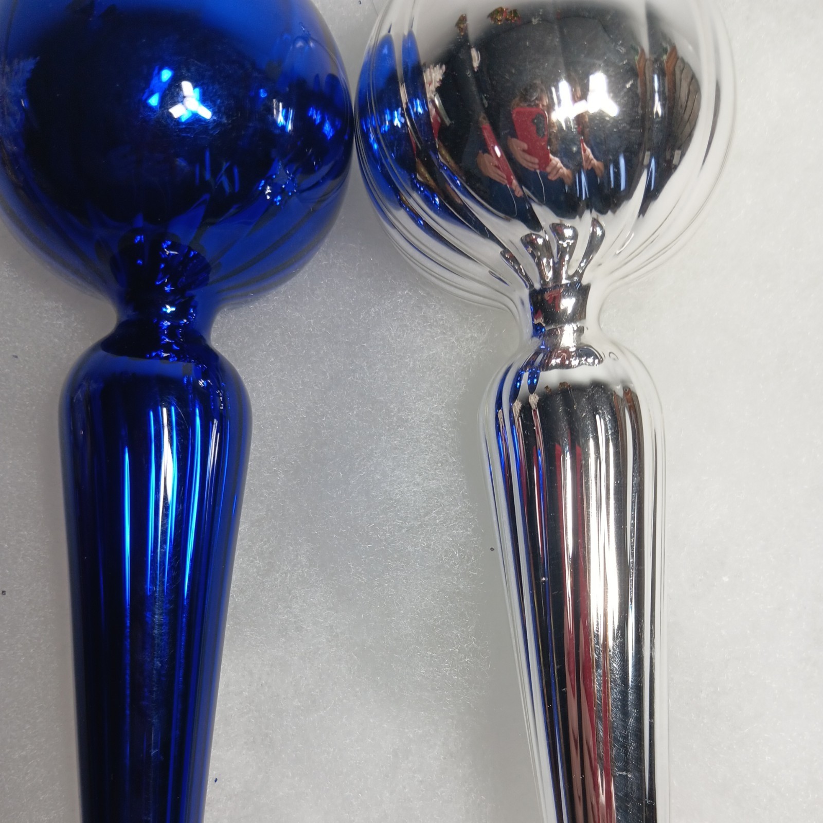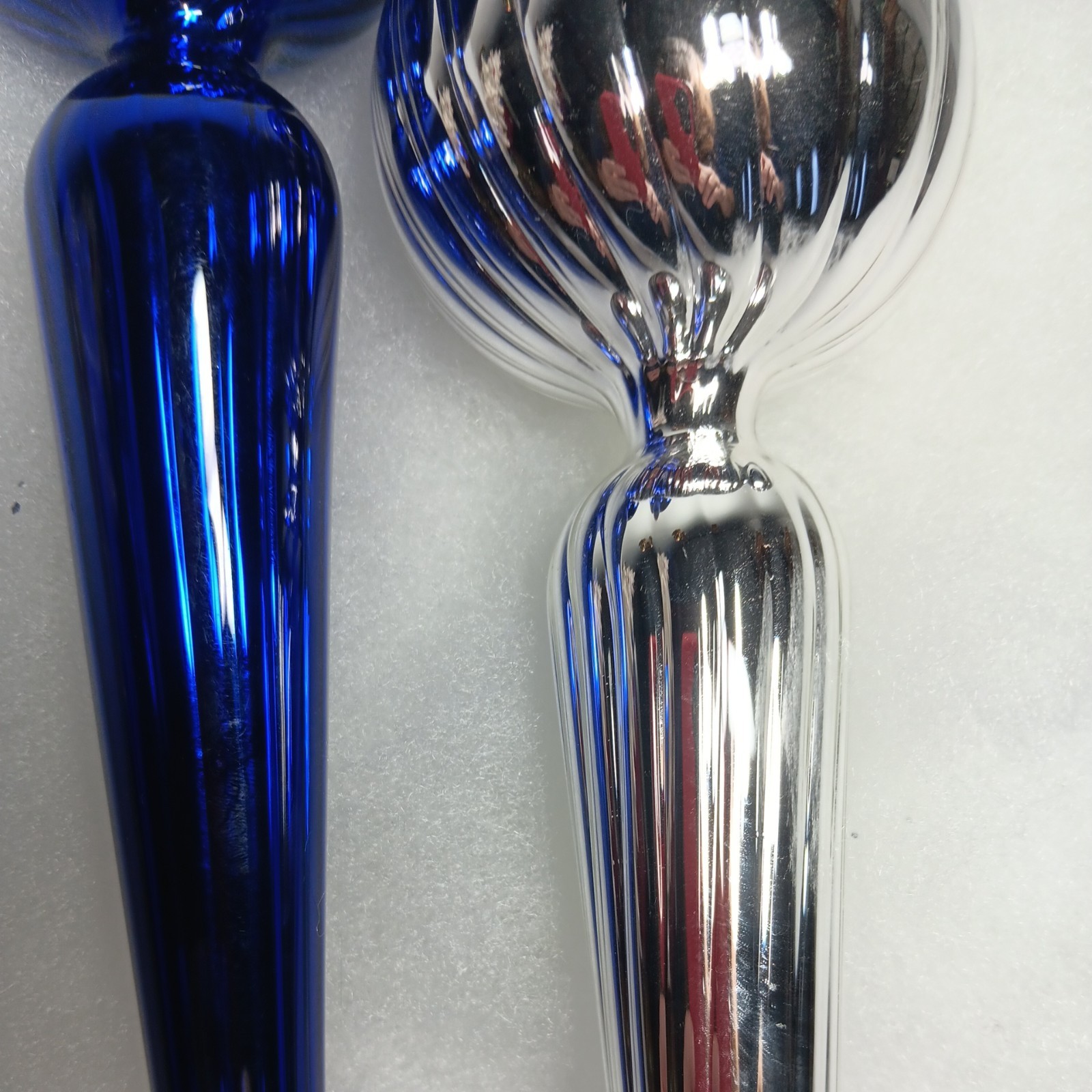 как выглядит 2 Beautiful Vtg. 15" Silver And Blue swirl Blown Glass finial teardrop ornaments фото