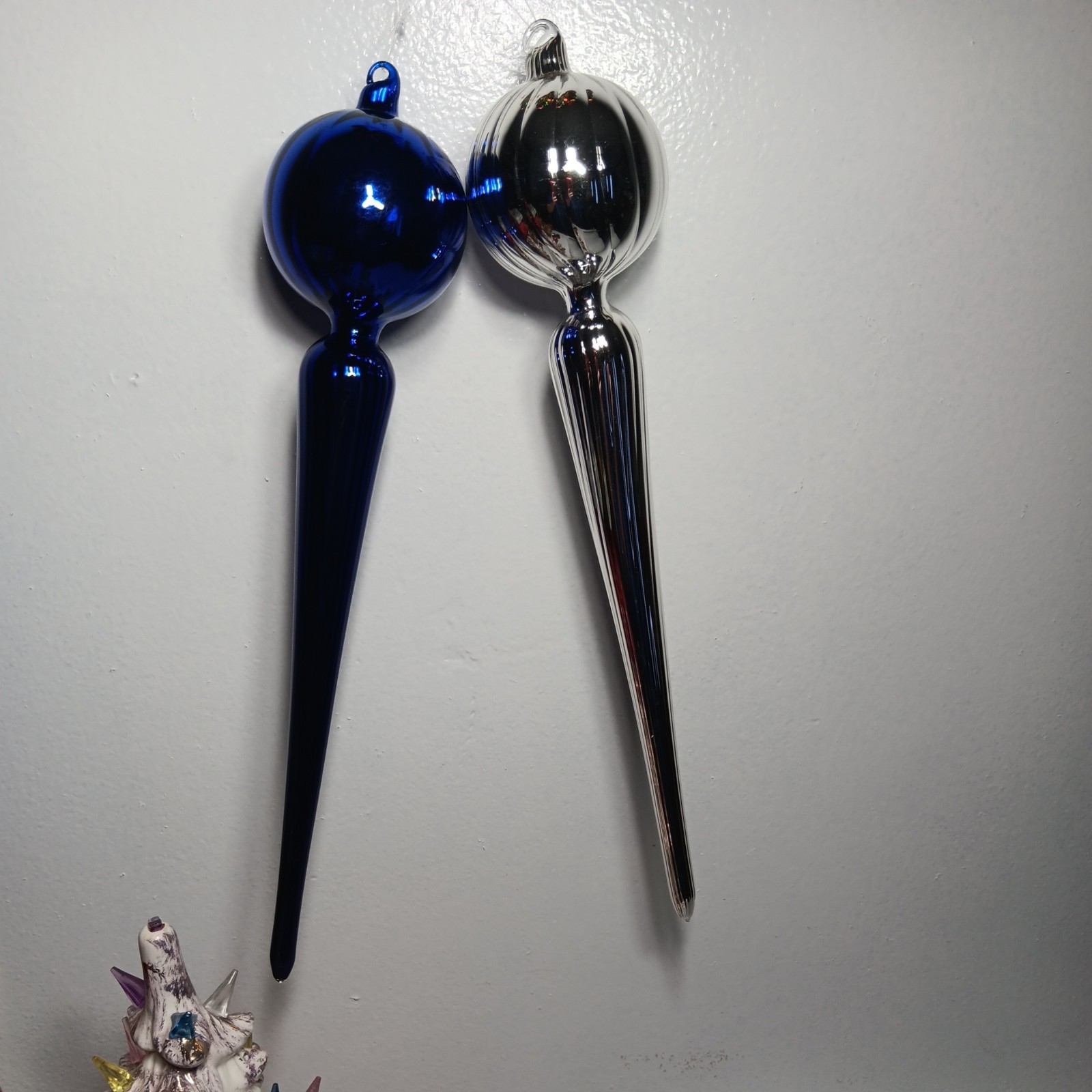 • 2 Beautiful Vtg. 15" Silver And Blue swirl Blown Glass finial teardrop ornaments
