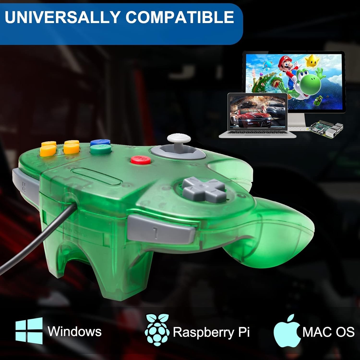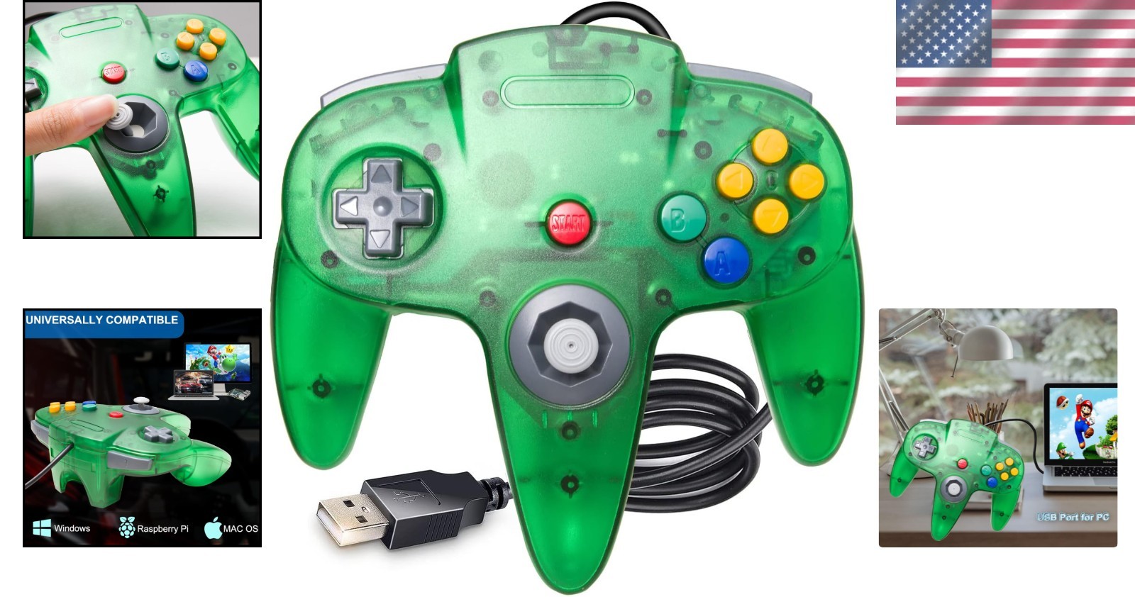 N64 Wired Joystick Controller for Windows PC and Mac - 10 Button Green Design