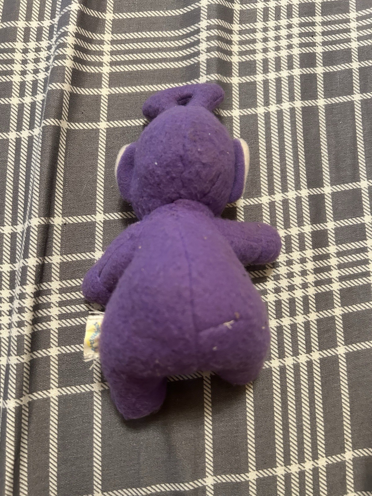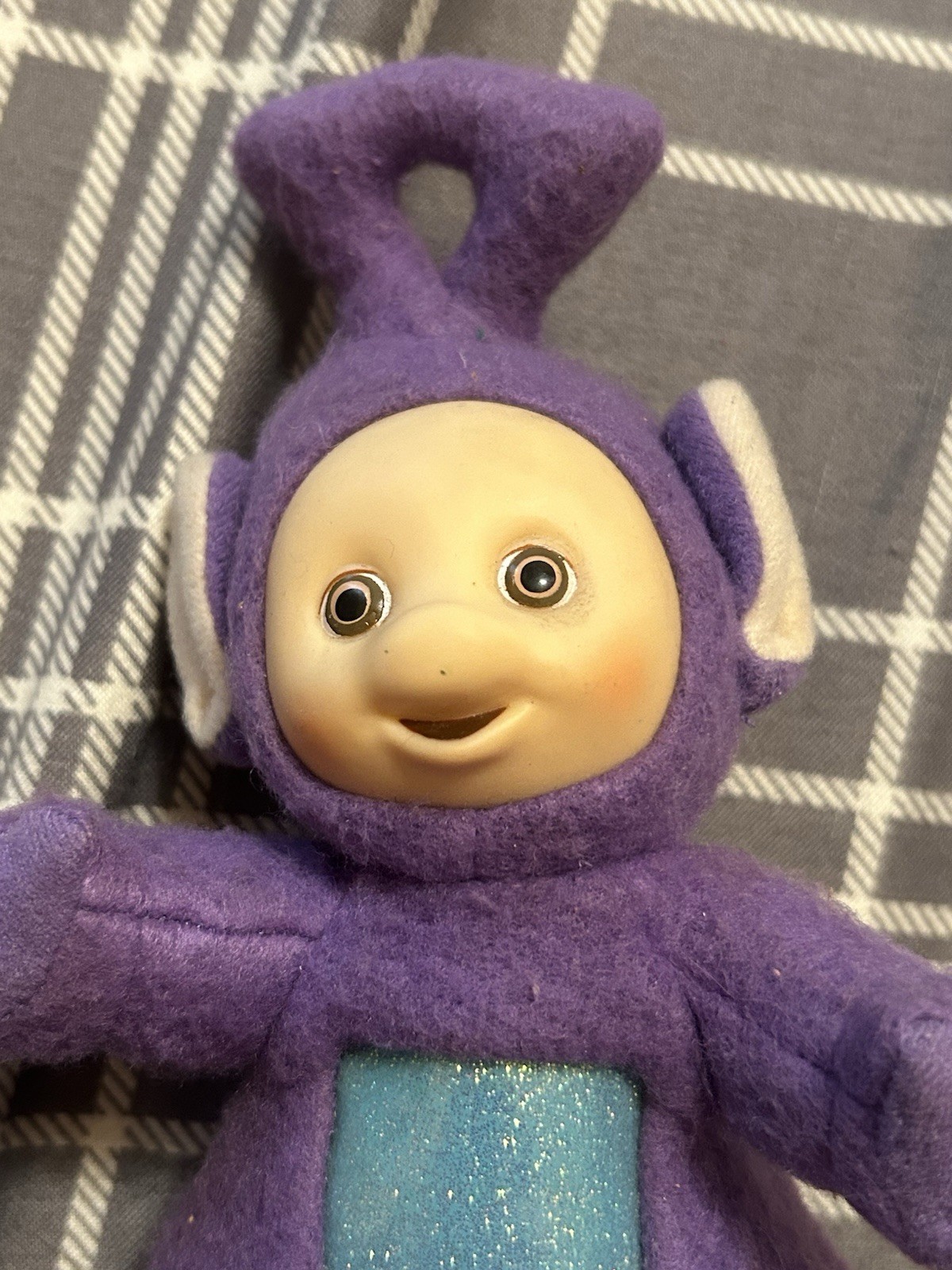 как выглядит Vtg 90s Playskool Teletubbies Tinky Winky 6 Rubber Face Plush Doll Purple фото