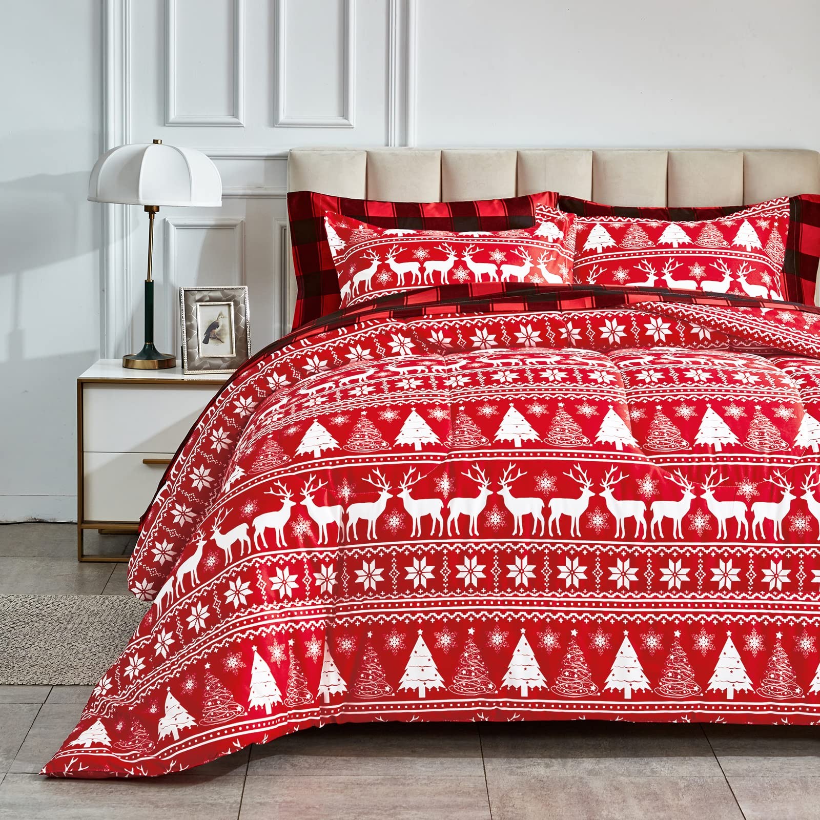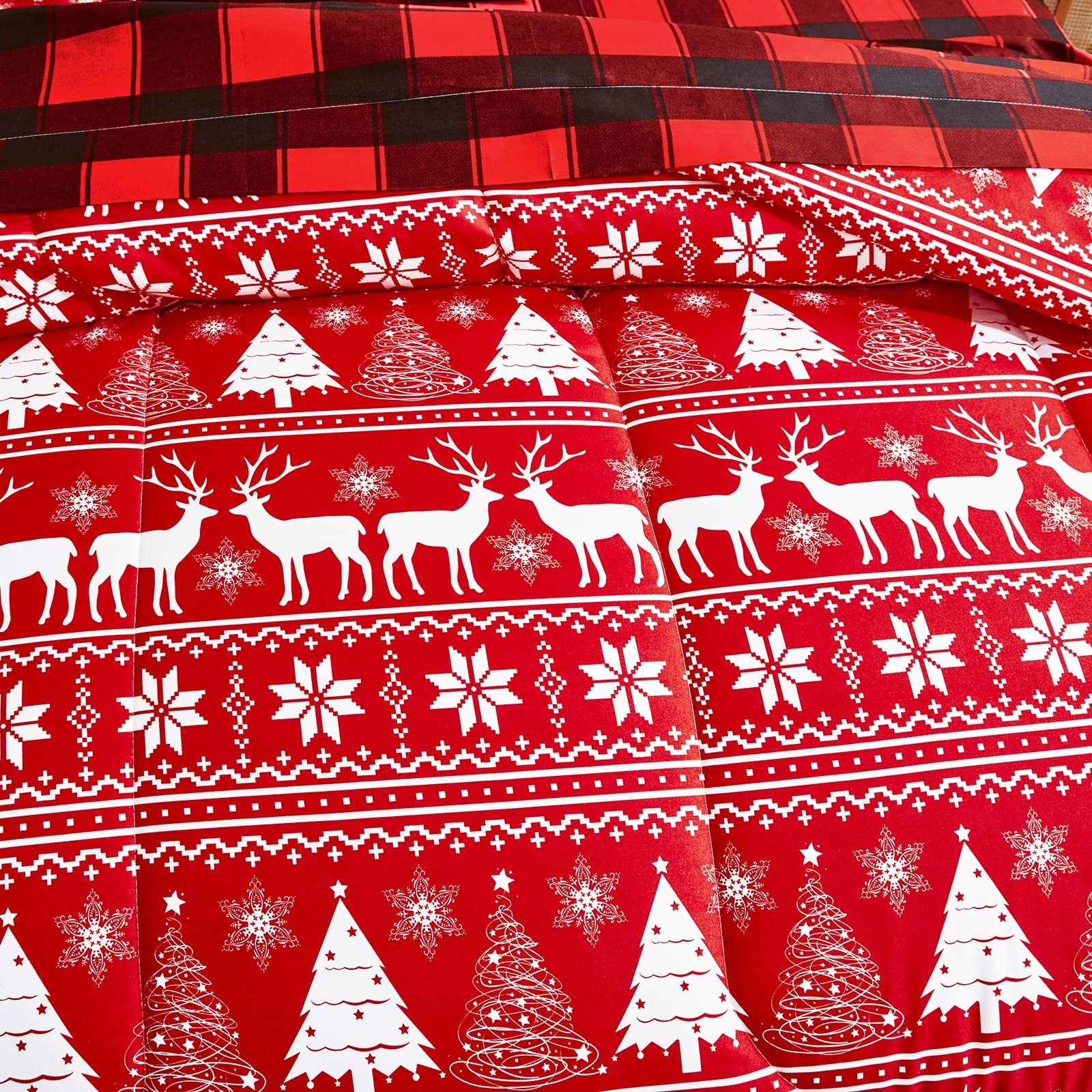 как выглядит Christmas Bed in a Bag 7 Pieces Queen, Red White Snowflake n Deers Trees Desi... фото