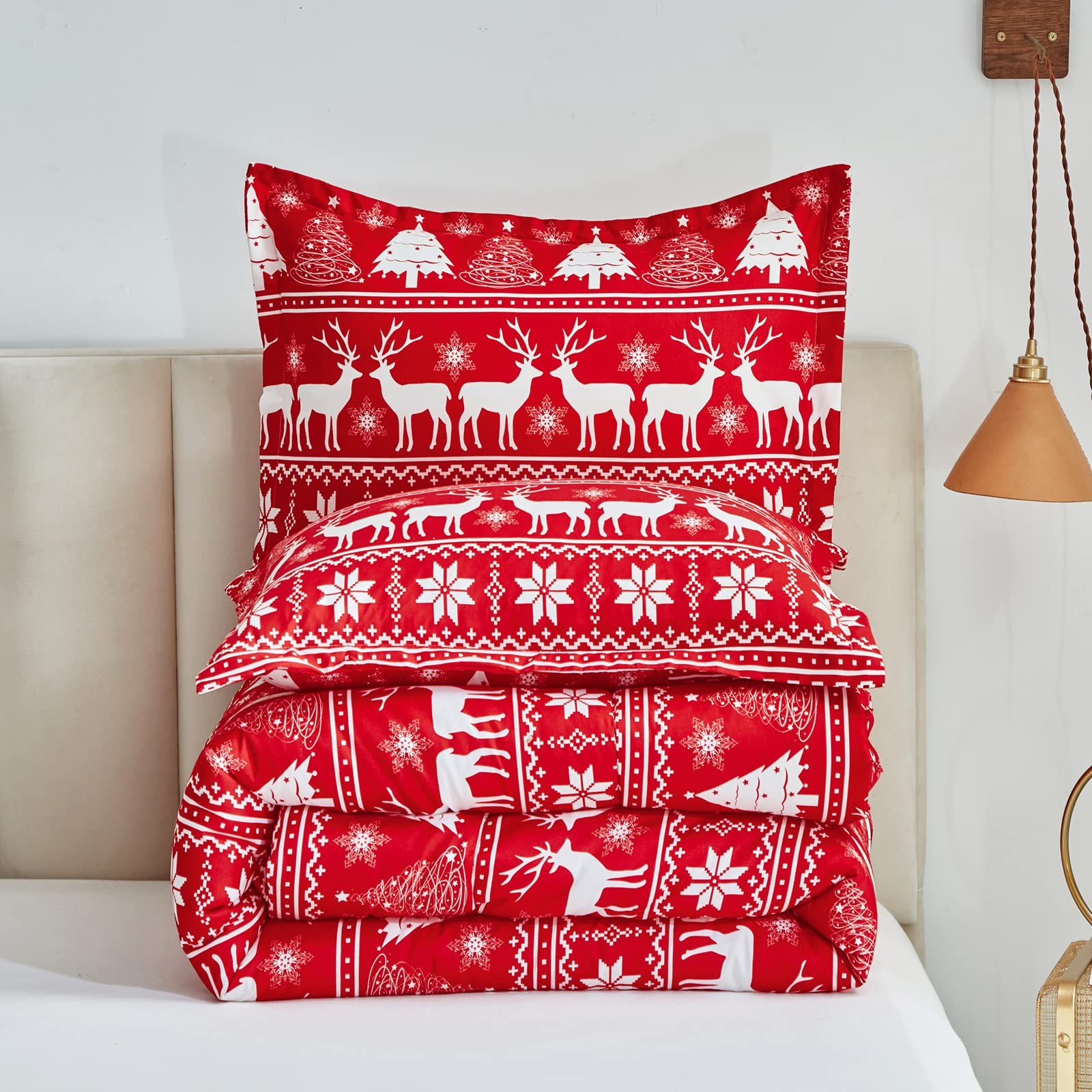 Christmas Bed in a Bag 7 Pieces Queen, Red White Snowflake n Deers Trees Desi...