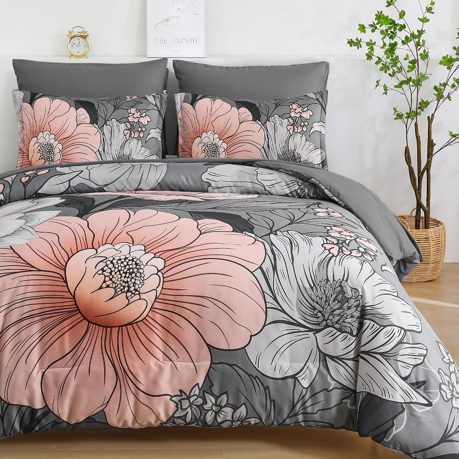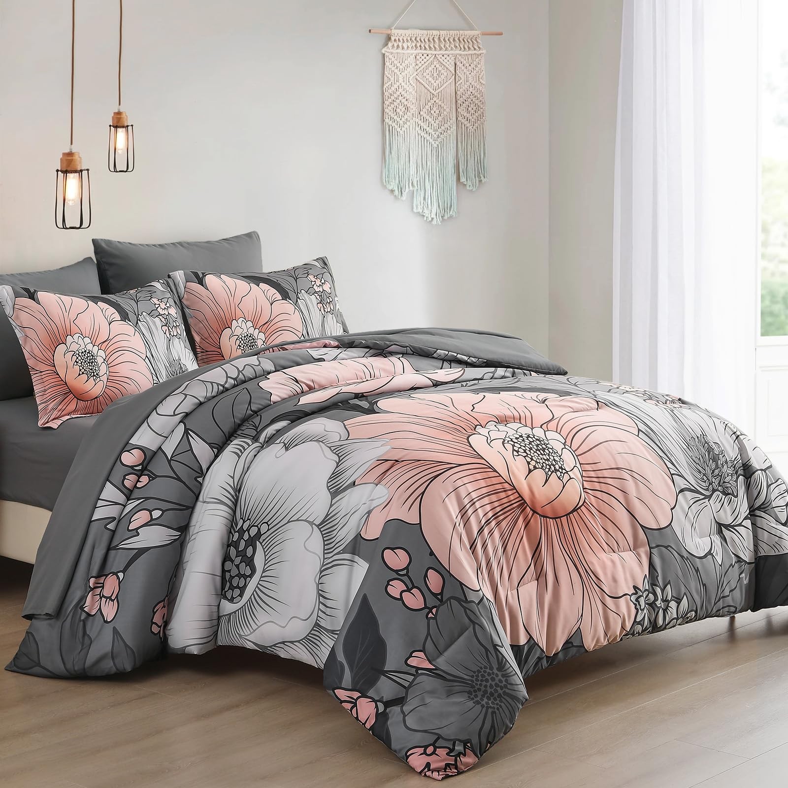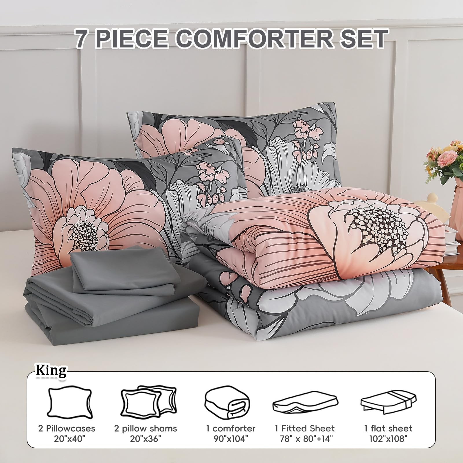 King Comforter Set 7 Pieces Grey Floral Comforter Set King Size Bed in a Bag ...