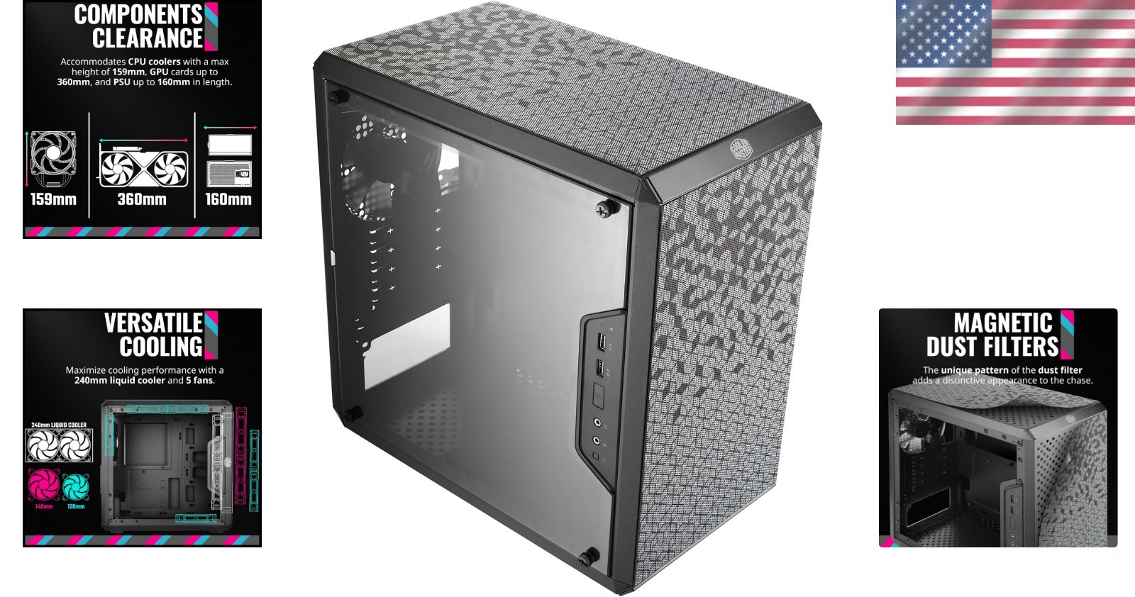 Особенности: AC Powered, Magnetic Design Dust Filter, Transparent Acrylic Side Panel, Adjustable I/O, Fully Ventilated Airflow, Open Thermal Design, Ample Interior Space, Supports GPU up to 360mm, Bottom Mount Power Supply, 4 Expansion Slots, 2 USB 3.0 Ports, 5 Fans Maximum, 1 Internal 3.5 inch Bay
