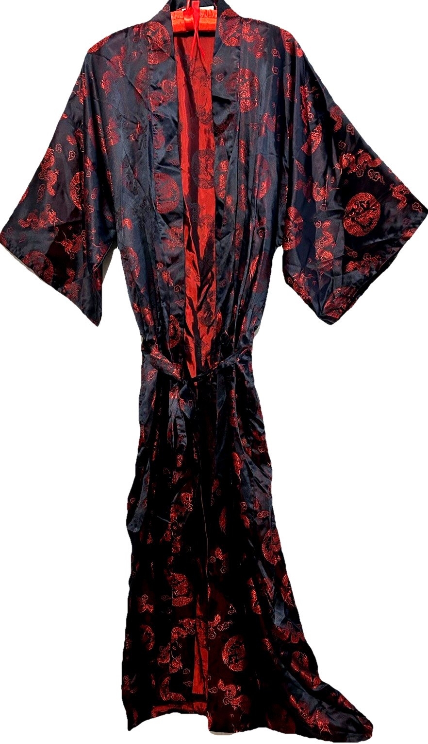 как выглядит Vintage Men s Chinese Satin Robe Smoking Jacket Red Black Dragon Embossed Belted фото