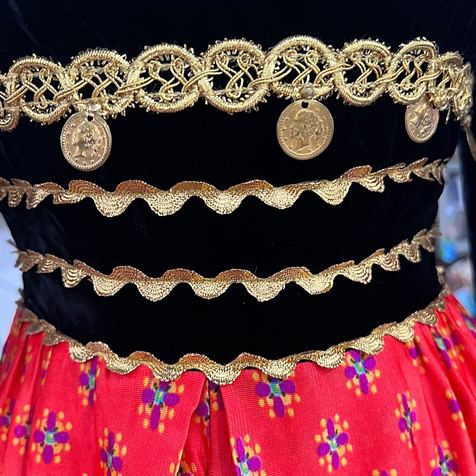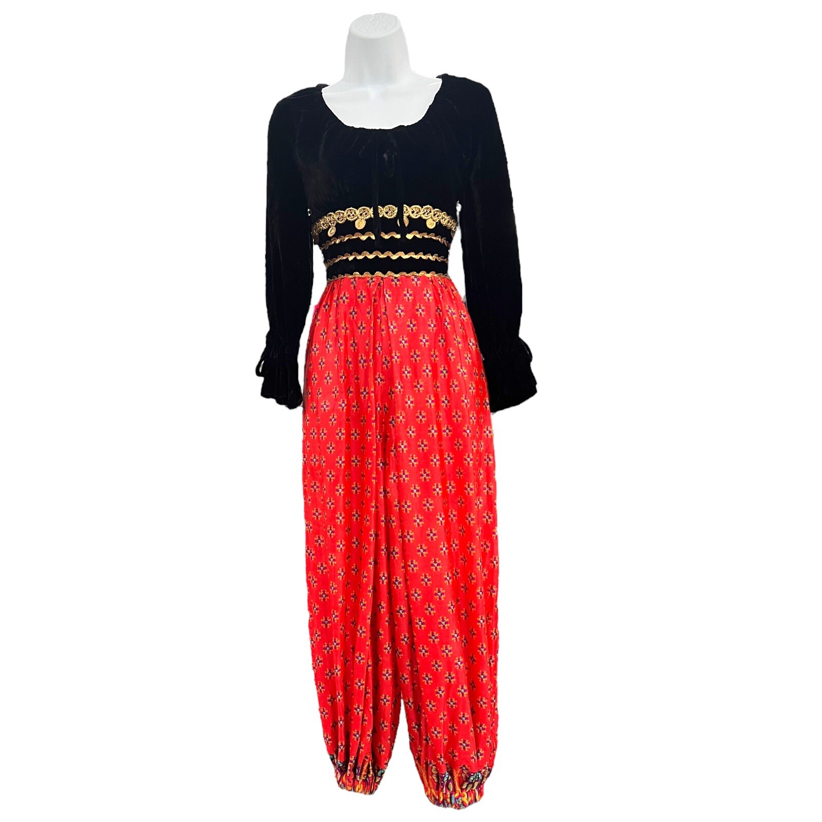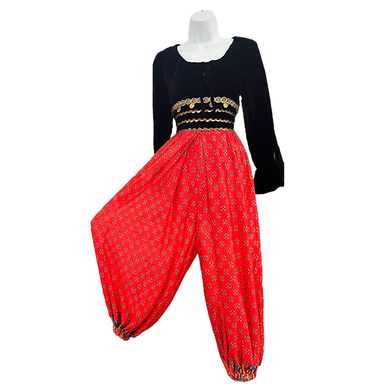 Vintage 1970s Hippie Peasant Bell Sleeve Boho 1960s Velvet Harem Jumpsuit