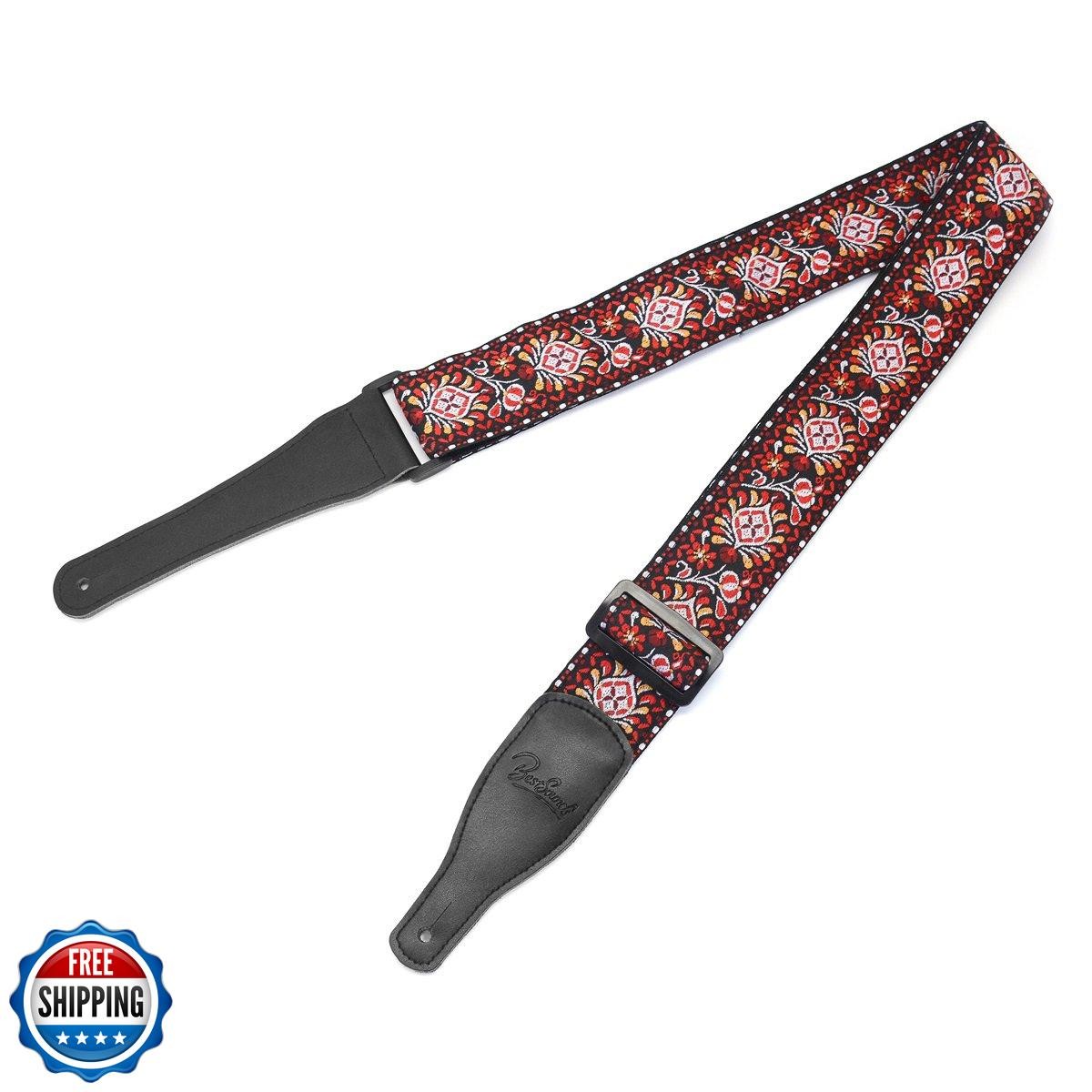 Guitar Strap, Jacquard Embroidered Cotton Strap with Genuine Leat