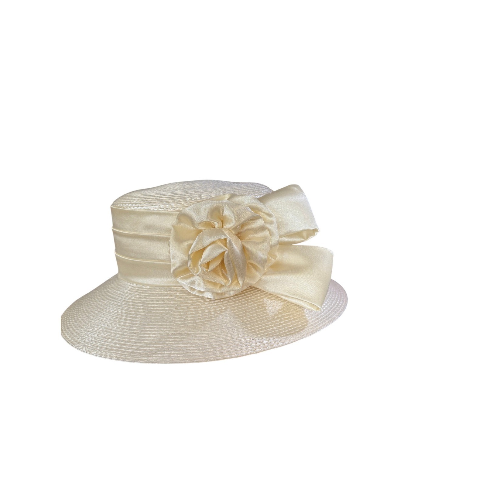 Elegant Cream Straw Sun Hat Women's Wide Brim Flower Bow Church Wedding