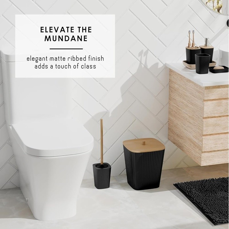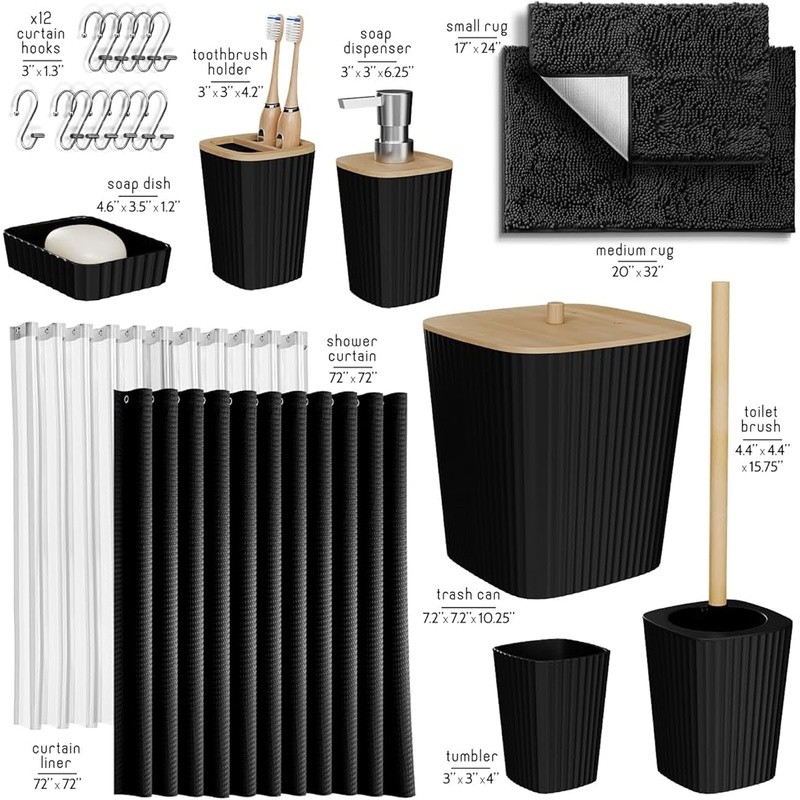 Set Includes: Soap Dish, Soap Dispenser, Toilet Brush, Toothbrush Holder, Tumbler, Shower Curtain, Shower Curtain Liner, 12 Shower Curtain Hooks, Trash Can