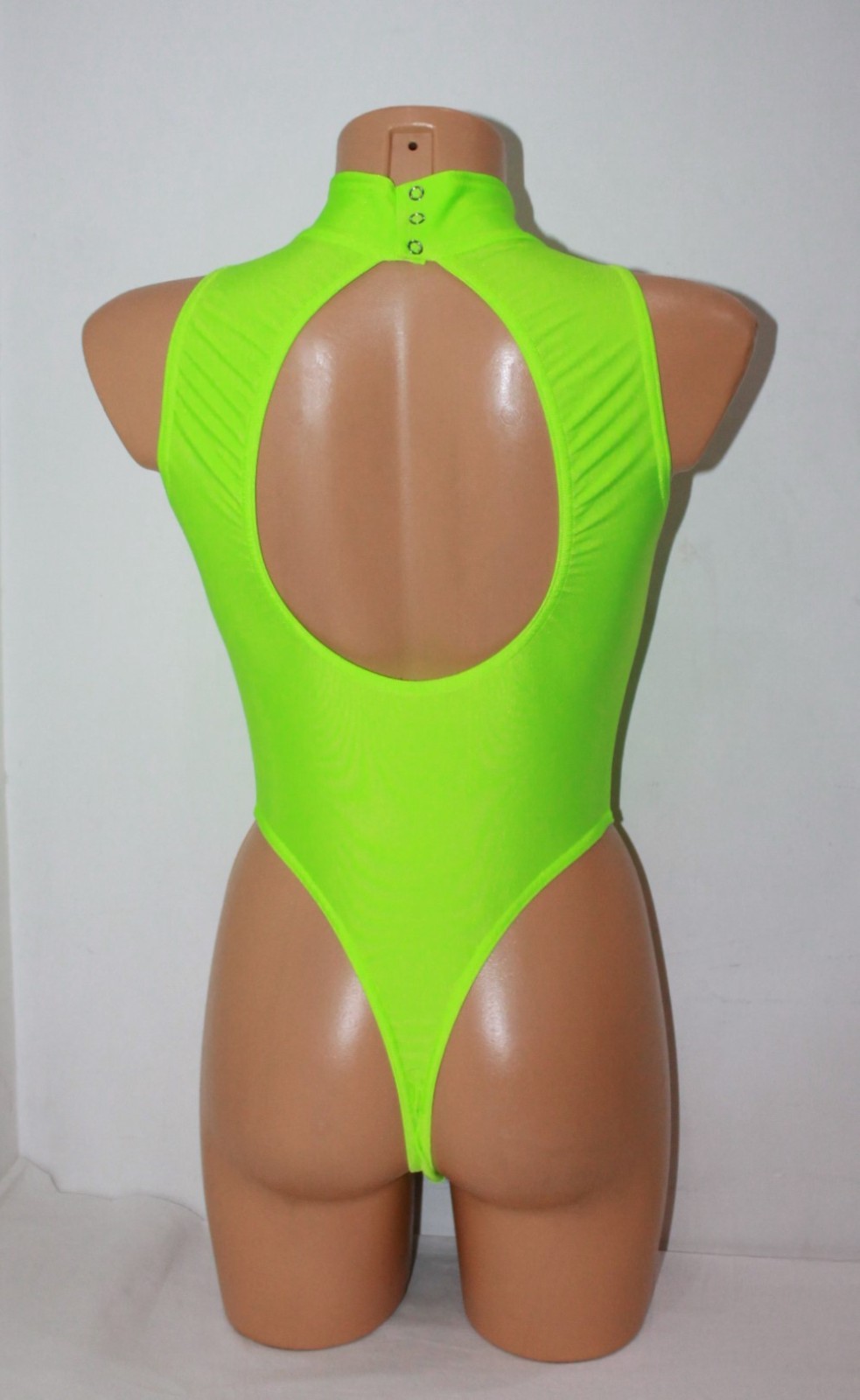 Women Leotard 204-18 High Collar Open Chest Open Back Lime Neon Spandex Size M