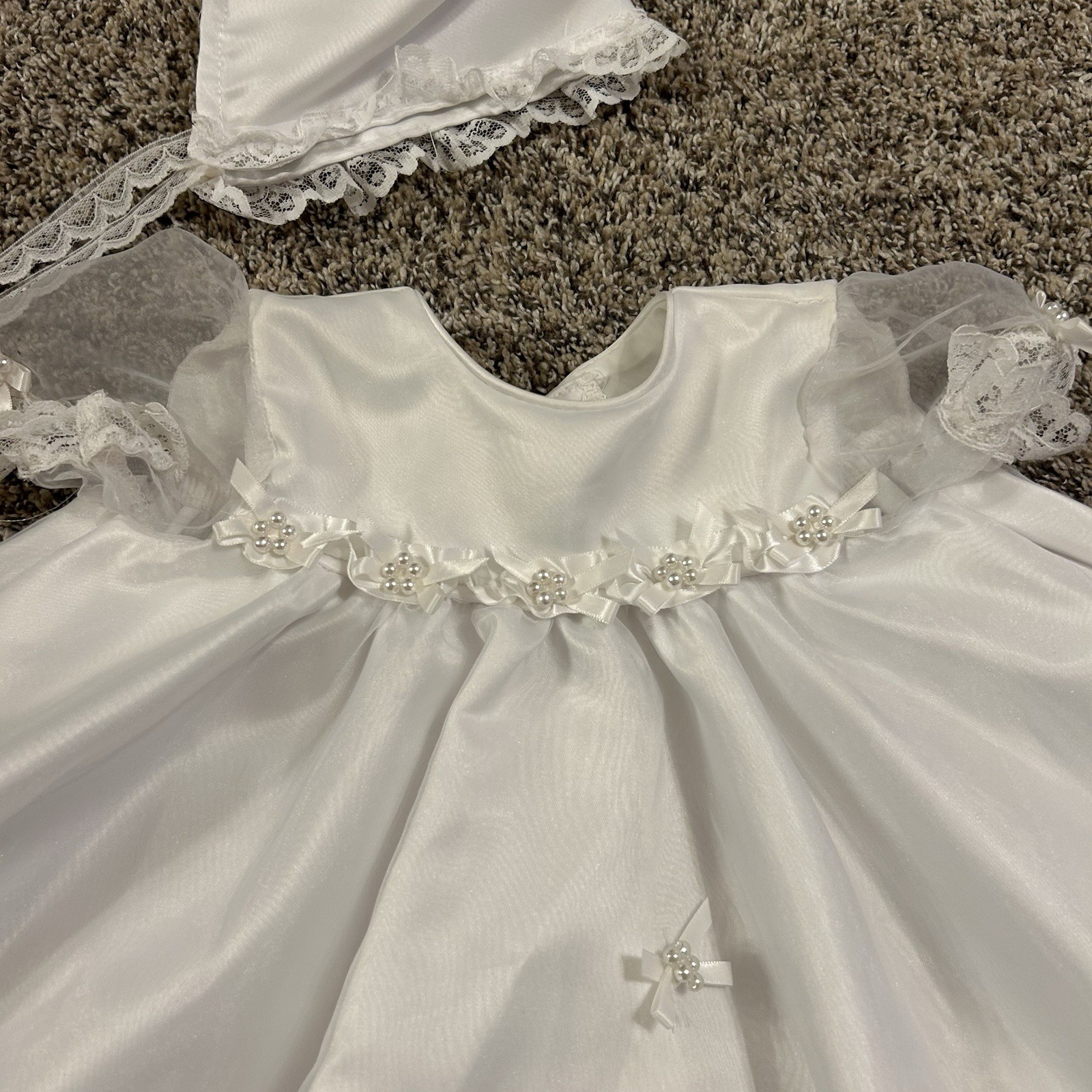 Baby Christening Gown Outfit by JoLene - Long Dress Bonnet White Satin Lace