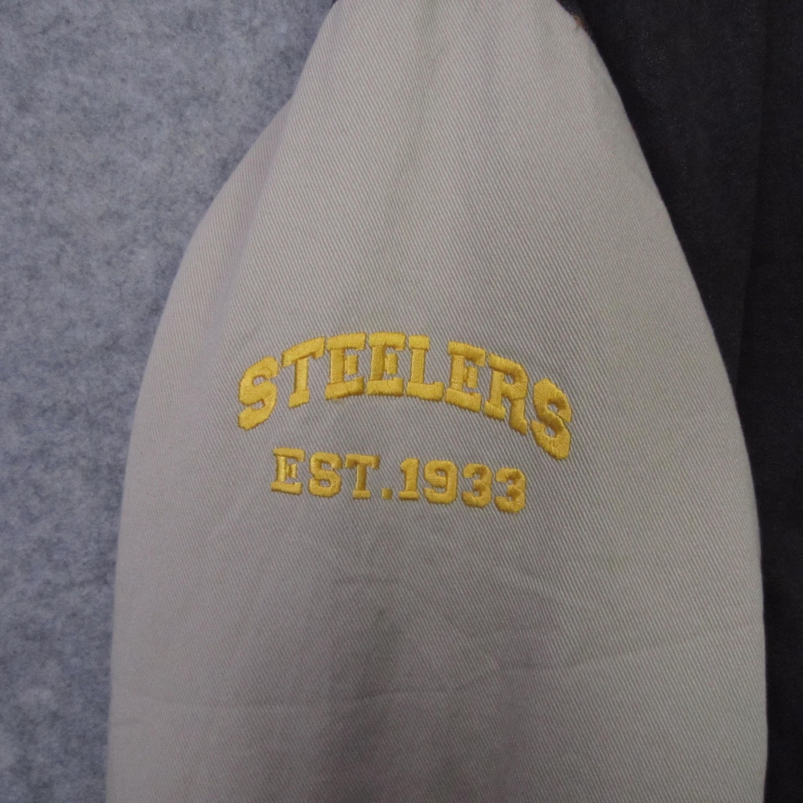 как выглядит Pittsburgh Steelers Jacket Mens Medium Black Tan NFL Football Varsity Bomber фото