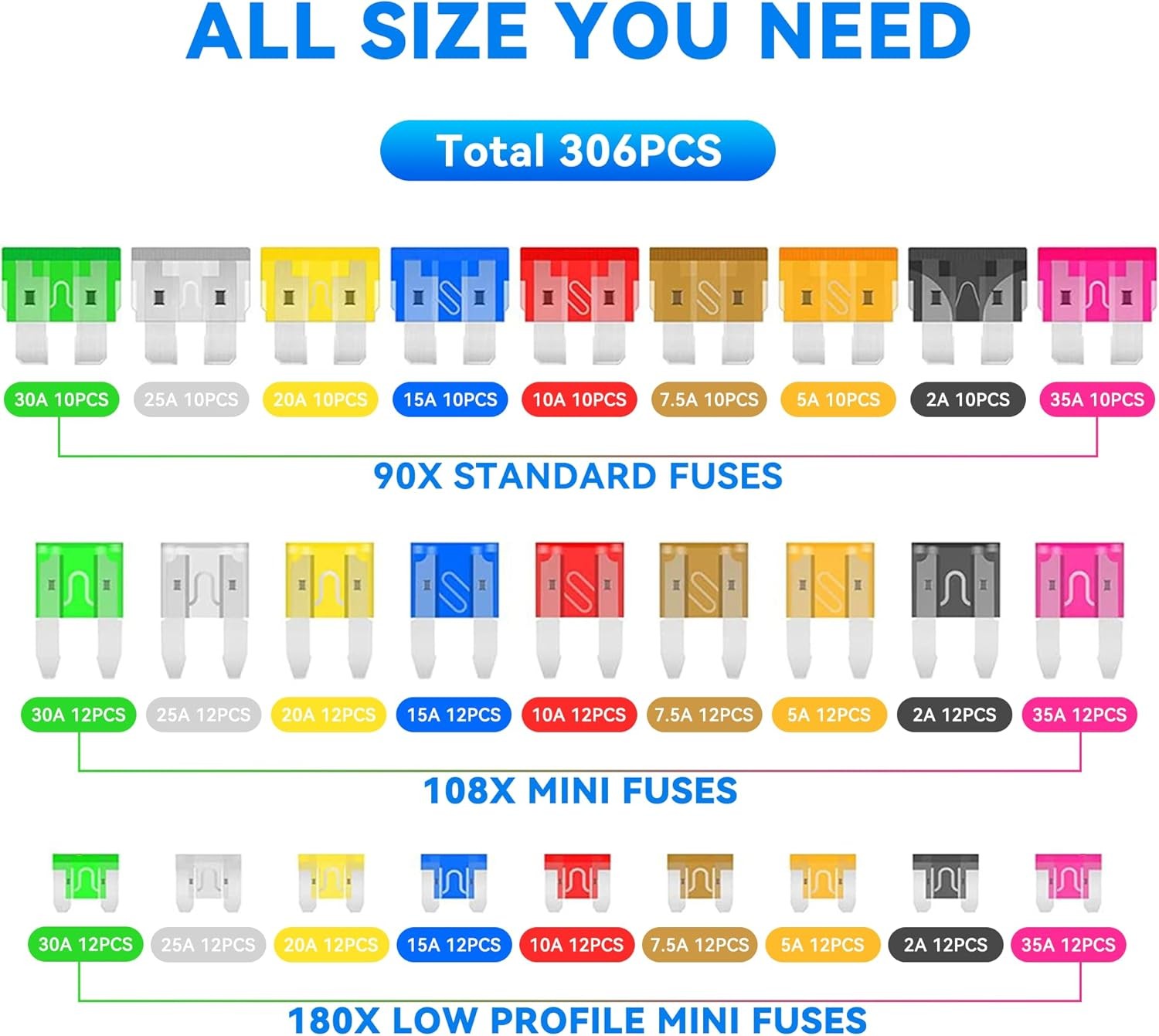 306PCS Car Fuses Assortment Kit, Mixed Vehicle Blade - Standard Mini Low Pro