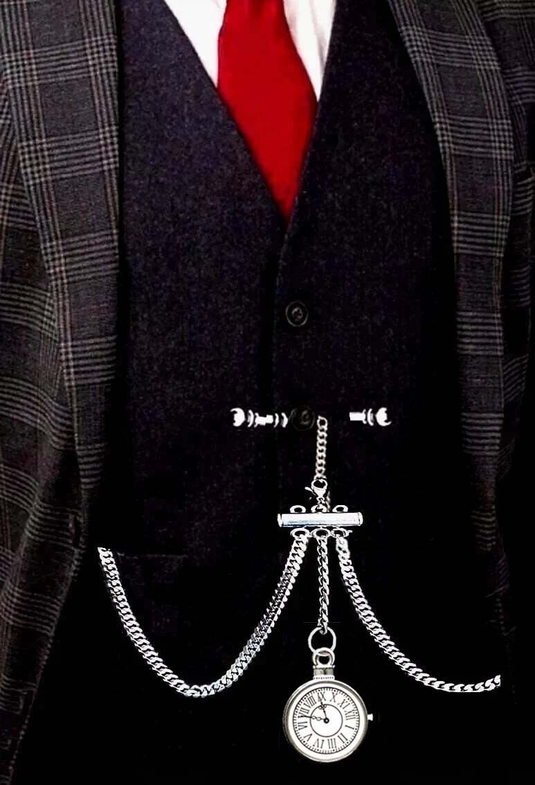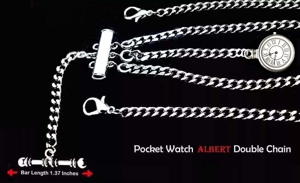 Very Strong Stainless Steel Pocket Watch Albert Double Chain With Ornate Fob.
