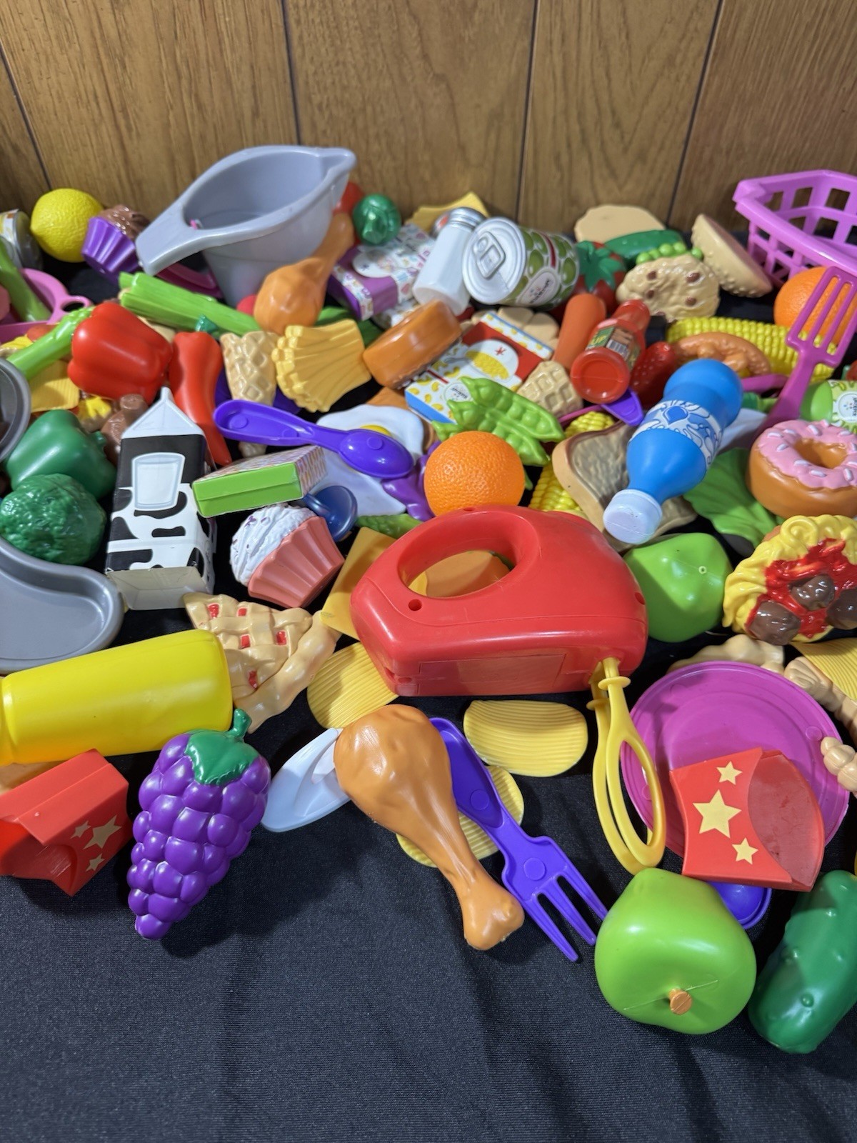 Huge Lot of Pretend Play Fake Food Items Toys Fruit Veggies Can Foods Chips Cups