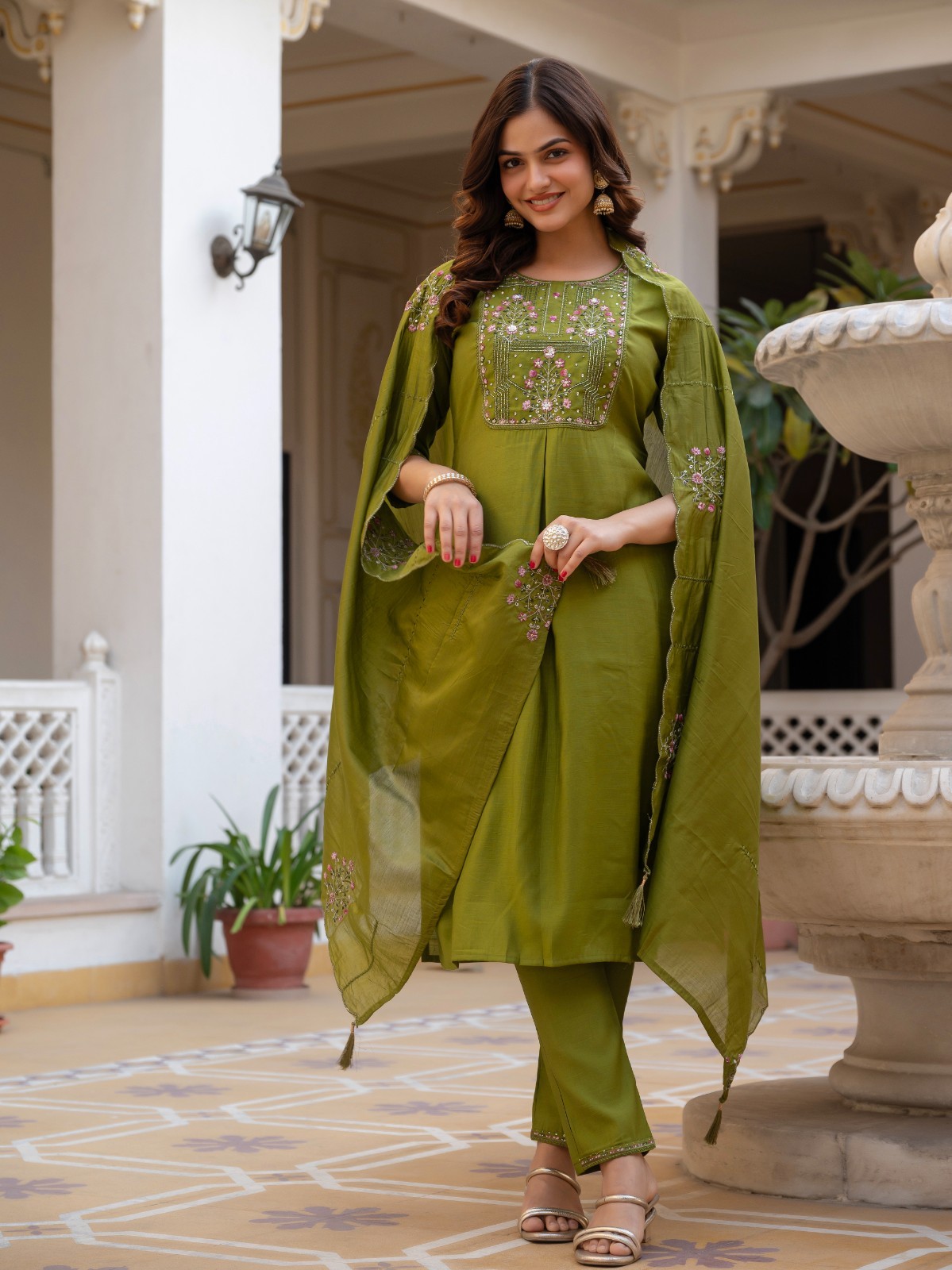как выглядит Indian Women Cotton Tunic Kurti Set Designer Wedding Wear Kurta Pant Dupatta Set фото