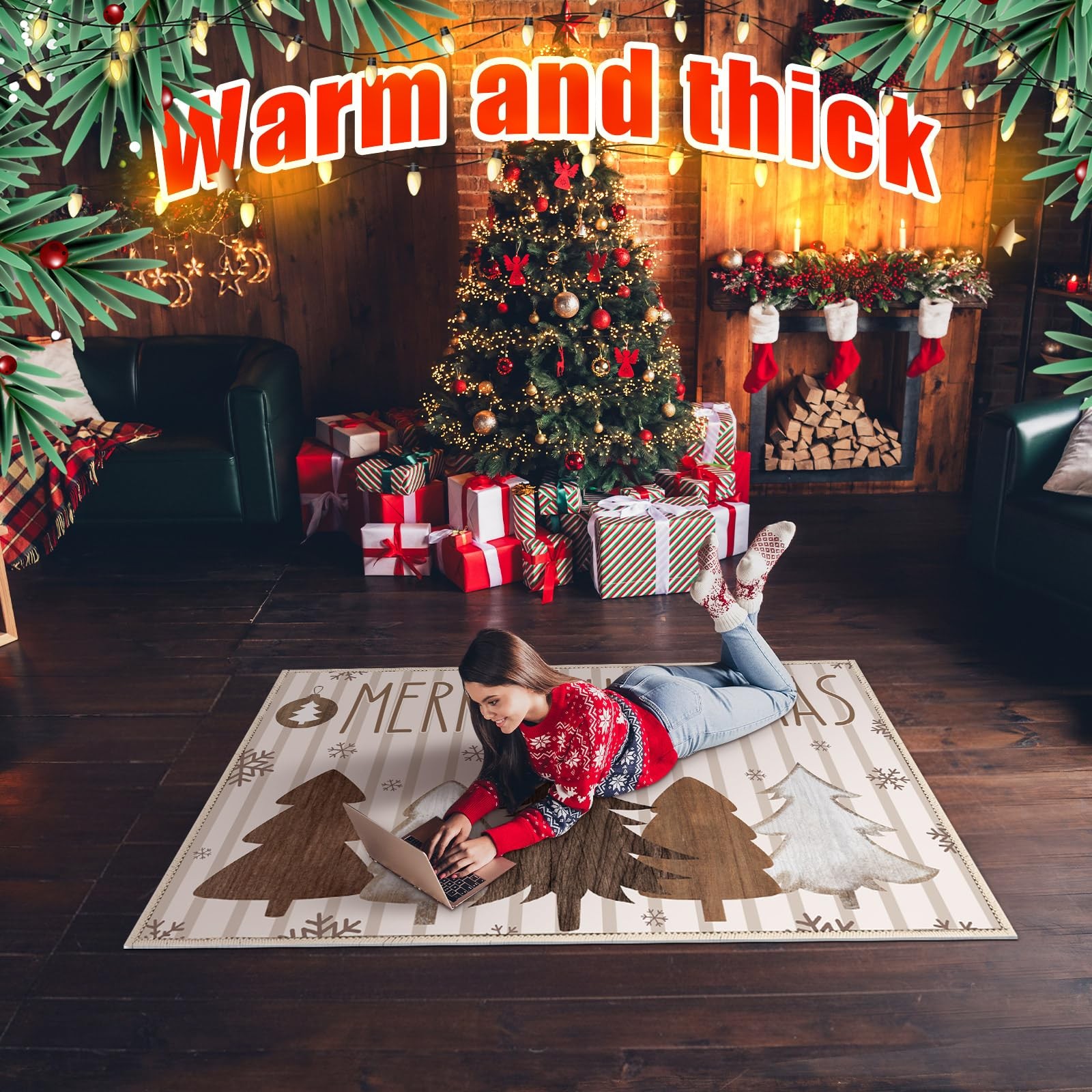 Christmas Area Rug 5 x 7 ft Brown Xmas Tree Merry Christmas Area Washable Rug...