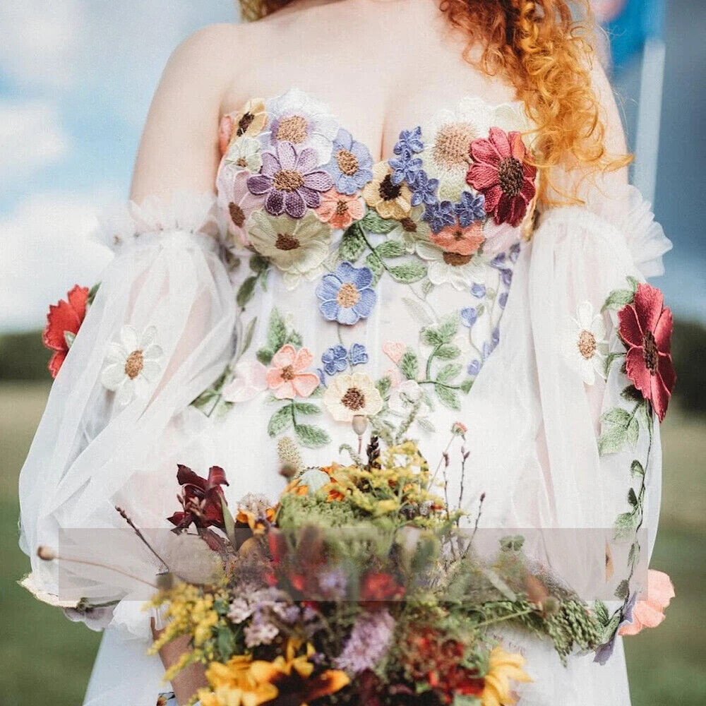 Elegant Flowers Wedding Dresses Sweetheart Puff Sleeves Tulle A-Line Bridal Gown