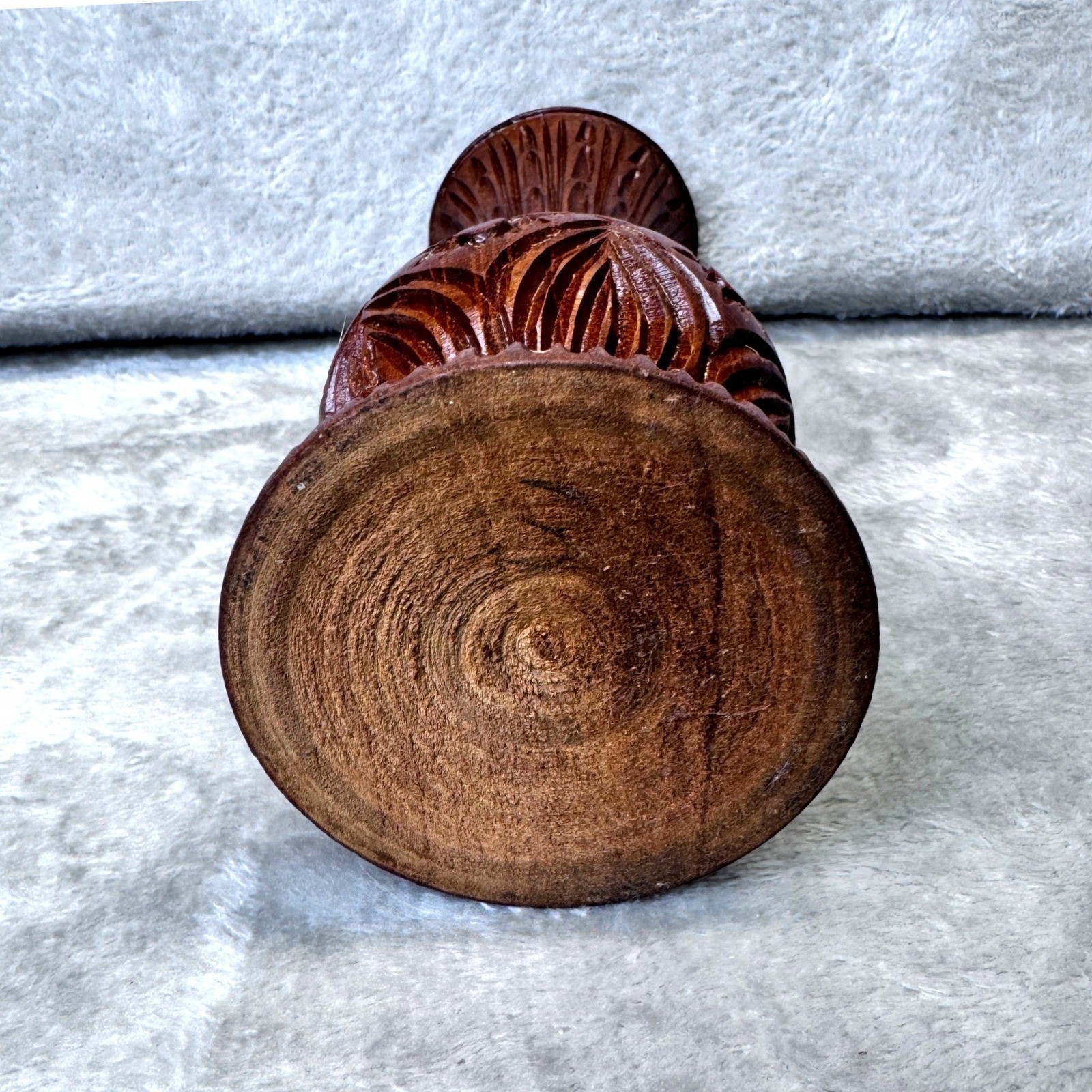MCM Folk Art Carved Wooden Vase Ornate Floral Design Dark Wood Decorative Accent